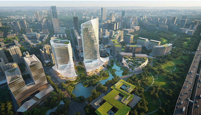 پارک نرم افزاري تيانفو که توسط گروه سرمايه گذاري فناوري پيشرفته چنگدو رهبري مي شود، به صورت استراتژيک در جنوب شرقي چنگدو قرار دارد و شکاف بين پراکندگي شهري و مناطق تپه اي اطراف را پر مي کند. اين کنار هم قرار گرفتن شهر و طبيعت با ابتکار «پارک شهر» دولت چنگدو همسو مي شود و زمينه را براي رابطه همزيستي بين معماري و محيط زيست فراهم مي کند. اين طرح شامل انگشتان سبزي است که از فضاهاي مجاور به ساختمان ها کشيده شده و طبيعت و نوآوري را در هم مي آميزد. اين پروژه پيشرفته که به عنوان خانه اي براي شرکت هاي بزرگ فناوري در نظر گرفته شده است، يک روحيه آينده نگر را در بر مي گيرد که عميقاً در معماري تعبيه شده است.