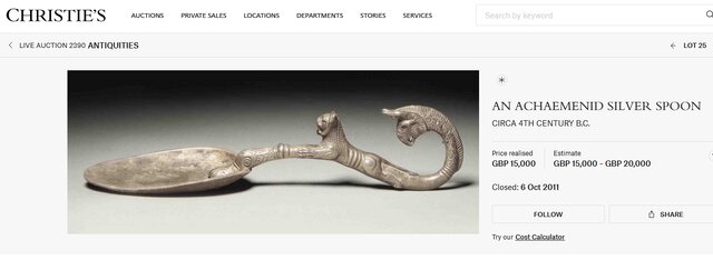 عکسي از قاشق نقرهاي هخامنشي با قدمت ۲۴۰۰ سال در شبکههاي اجتماعي به همراه اين خبر که «قاشق دزديدهشده از ايران در حراجي کريستيز فروخته شد»، ميچرخد. معلوم نيست منشأ اين قاشق کجا و خريدار آن که بوده، اما کريستيز اين قاشق پررمز و راز را حدود ۱۲ سال پيش فروخته است.