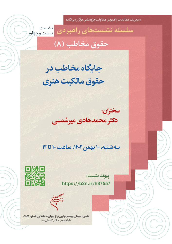 به گزارش گالري آنلاين به نقل از روابطعمومي فرهنگستان هنر، هشتمين نشست راهبردي حقوق مخاطب به نشست تخصصي «جايگاه مخاطب در حقوق مالکيت هنري» اختصاص دارد. در اين نشست محمدهادي ميرشمسي، استاديار دانشکده حقوق و علوم سياسي دانشگاه علامه طباطبايي به سخنراني ميپردازد.