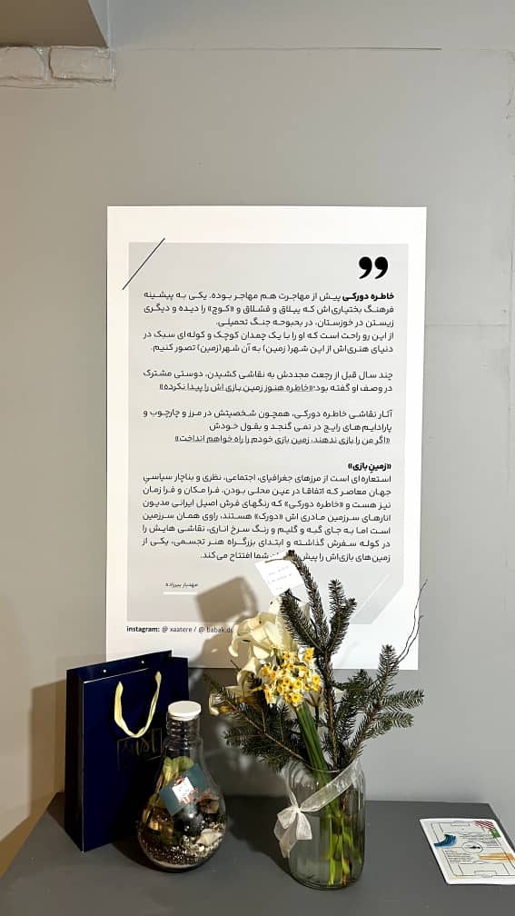 عنوان اين نمايشگاه "زمين بازي" است. هنرمند داستان پشت اين عنوان را برايمان چنين تعريف کرد: من پيش از مهاجرت از ايران هم مهاجر بودهام. يکي به واسطه پيشينه فرهنگ بختياريام که گويي ييلاق و قشلاق و "کوچ" در روح ناآرام و بيقرار من سرريز گشته و ديگري زيستن در خوزستان، در بهبوحه جنگ که منجر به نقل مکان از شهري به شهر ديگر ميشد. از اين رو راحت است که من را با چمداني کوچک و کولهاي سبک در سفر زندگي واقعي و دنياي هنريام از اين سرزمين به آن سرزمين تصور کرد.