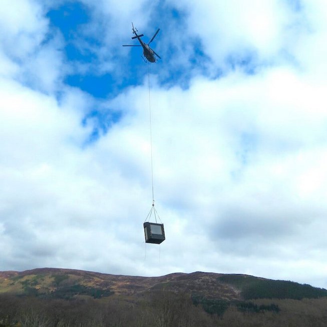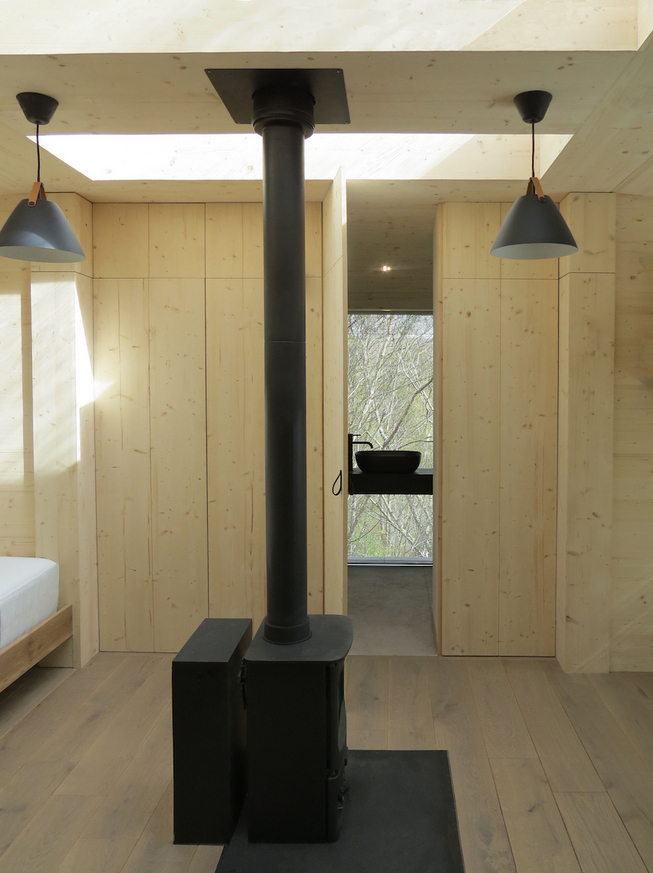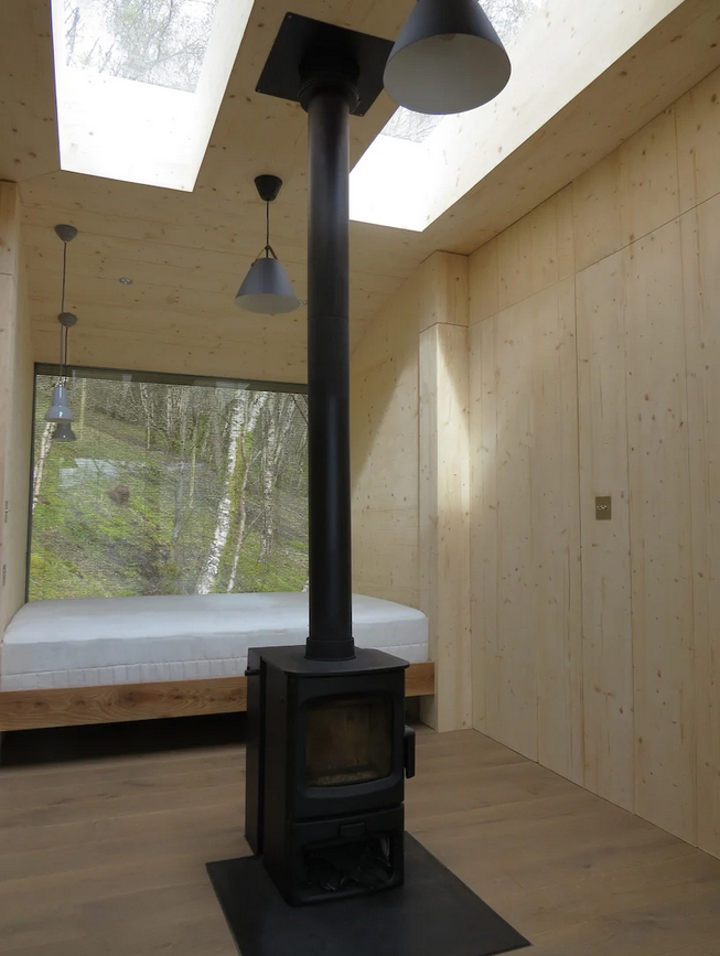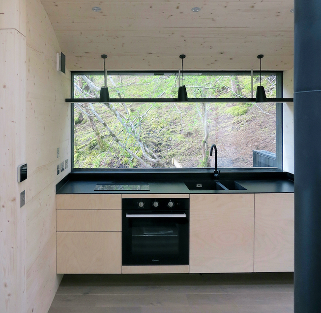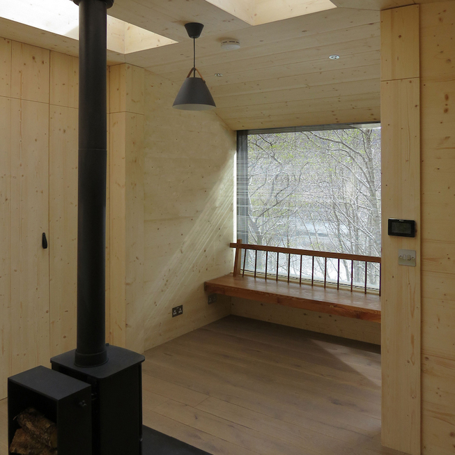 اين کلبه چوبي يکي از مجموعه ساختمانهاي کوچک سفارشي و طراحي شده براي مکان خاص است که توسط Echo در کارگاههايش واقع در جنوب غربي اسکاتلند طراحي و ساخته شده است. هر يک از 5 قطعه پيش ساخته با وزني کمتر از 1 تن و حداکثر ظرفيت بار حمل هوايي در محل شيب دار طراحي شده اند. با هدف به حداقل رساندن ميزان دستخوردگي محل يک سکوي فولادي گالوانيزه طراحي شده که به سنگ بستر متصل مي شود.