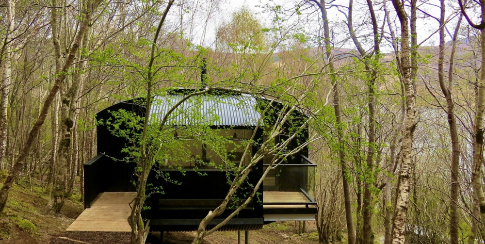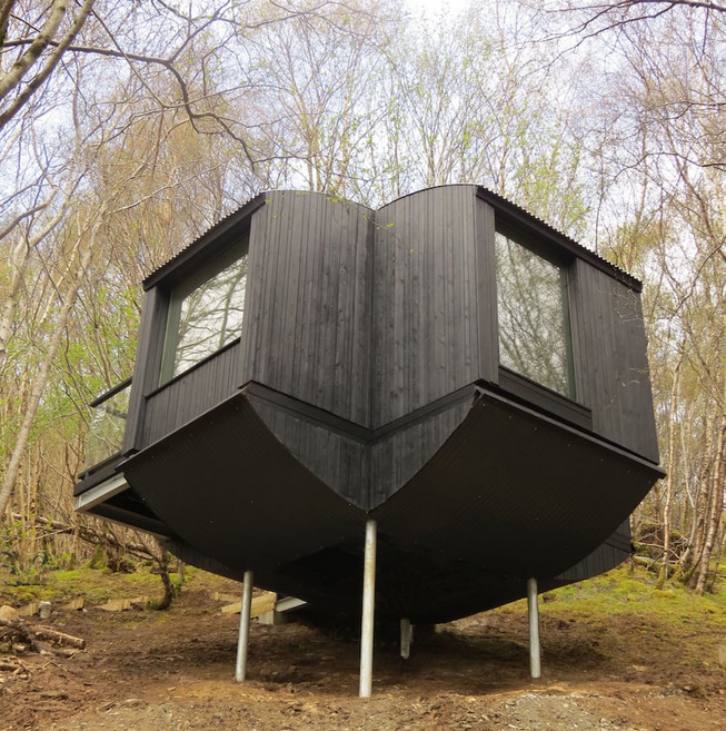 خانه درختي خميده و معلق با نماي چوبي از درخت سياه کاج بر فراز تپه شيب دار در ارتفاعات اسکاتلند ساخته شده است.