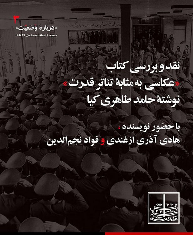 نقد و بررسي کتاب «عکاسي به مثابه تئاتر قدرت» نوشتهي حامد طاهري کيا، جمعه ۴ اسفند ۱۴۰۲ ساعت ۱۶ الي ۱۸ از سلسله نشستهاي «درباره وضعيت» با دبيري ژوبين عبدياني و با حضور هادي آذري ازغندي، فواد نجمالدين و حامد طاهري کيا در موسسه خوانش برگزار ميشود.