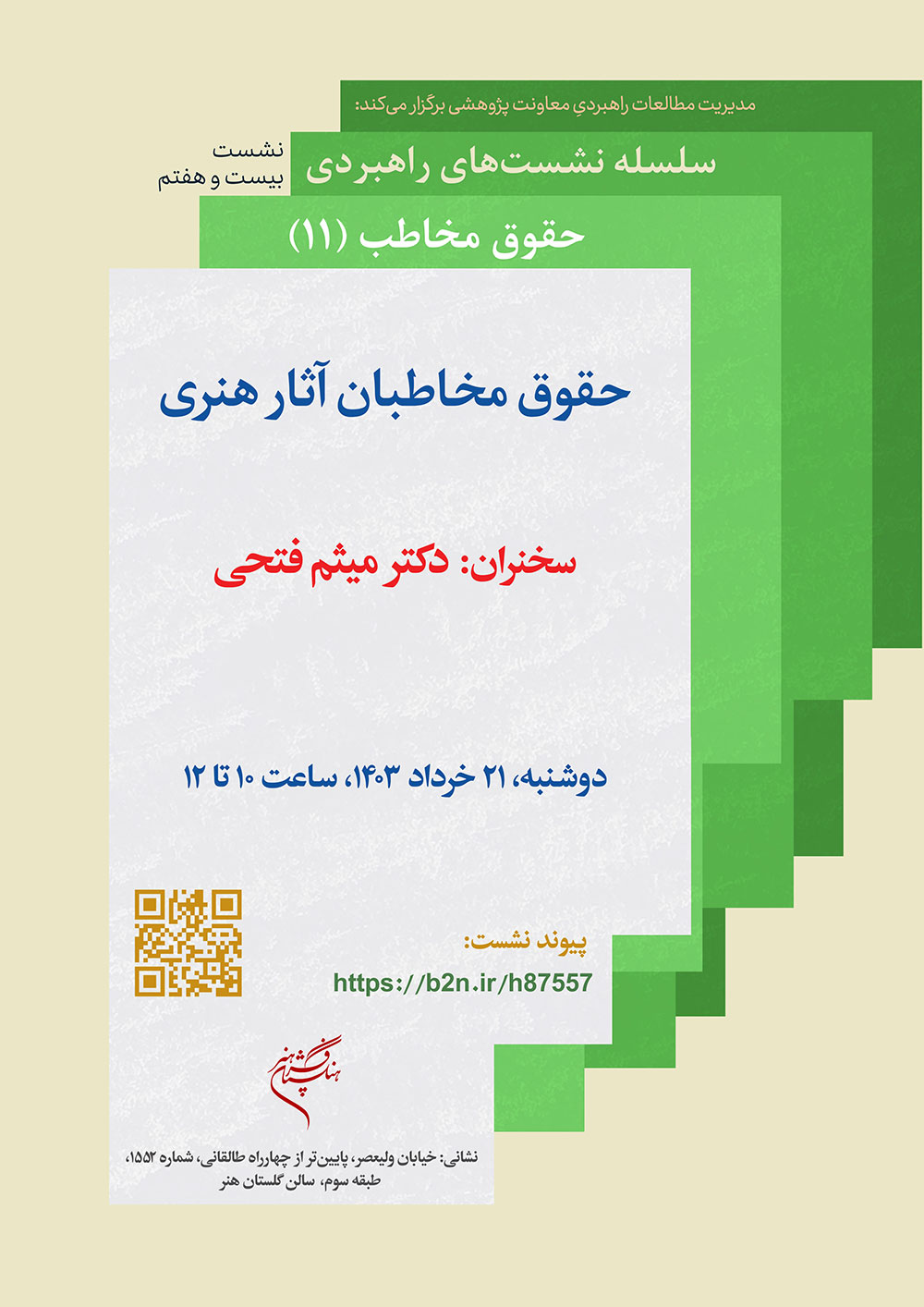 علاقهمندان براي شرکت در آن ميتوانند به نشاني خيابان وليعصر، پايينتر از چهارراه طالقاني، شماره 1552، طبقه سوم، سالن گلستان هنر مراجعه يا از طريق نشاني پيوند مجازي https://b2n.ir/h87557 به نشست متصل شوند.