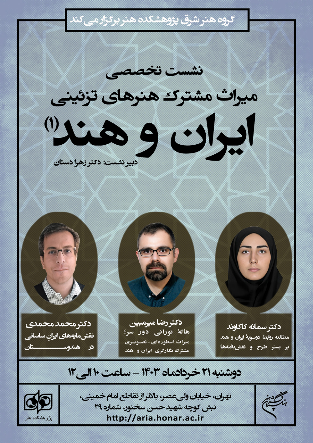 به گزارشگالري آنلاينبه نقل از روابط‌‌ عمومي پژوهشکده هنر، گروه پژوهشي هنر شرق پژوهشکده هنر، نشست تخصصي «ميراث مشترک هنرهاي تزئيني ايران و هند» را برگزار مي‌کند. در اين نشست تخصصي سمانه کاکاوند، با موضوع «مطالعه روابط دو سويه ايران و هند بر بستر طرح و نقش‌بافته‌ها»، رضا ميرمبين،با موضوع «هاله نوراني دور سر؛ ميراث اسطوره‌اي – تصويري مشترک نگارگري ايران و هند» و محمد محمدي، با موضوع «نقش‌مايه‌هاي ايران ساساني در هندوستان» سخنراني مي‌کنند.
