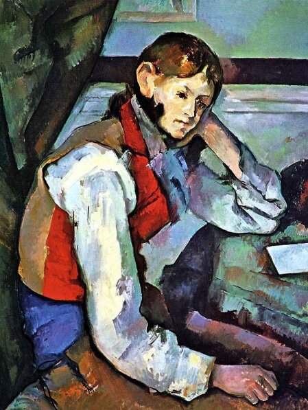 «سزان» در مجموع چهار پرتره رنگ روغن از اين پسر ايتاليايي با جليقه قرمز و در ژستهاي متفاوت خلق کرد. اين نقاشي در فوريه سال ۲۰۰۸ از يک بنياد «E.G. Bührle» در زوريخ ربوده شد. اين نقاشي که ۹۱ ميليون دلار ارزش داشت، گرانترين نقاشي آن موزه محسوب ميشد. خوشبختانه اين نقاشي در آوريل ۲۰۱۲ در صربستان پيدا شد.