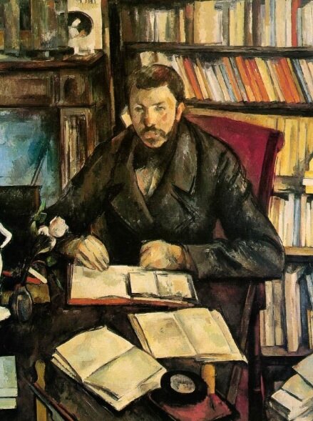 «گوستاو جفروي» منتقد هنري بود که نقاشيهاي «سزان» را تحسين ميکرد. «سزان» در بهار ۱۸۹۵ براي تشکر از او پيشنهاد داد که پرتره او را خلق کند. سزان نقاشي صورت و دستها را تا آخرين لحظه به تعويق انداخت و با ناتمام گذاشتن آنها تابلو را ارائه کرد. شکل جفروي يک مثلث قوي در مرکز نقاشي تشکيل ميدهد. محيط ـ کتابها، جوهردان، گل رز، مجسمه، همگي در کنار هم فعاليتها و سليقه اين سوژه را بدون پيچيدگي به مخاطب نشان ميدهند.