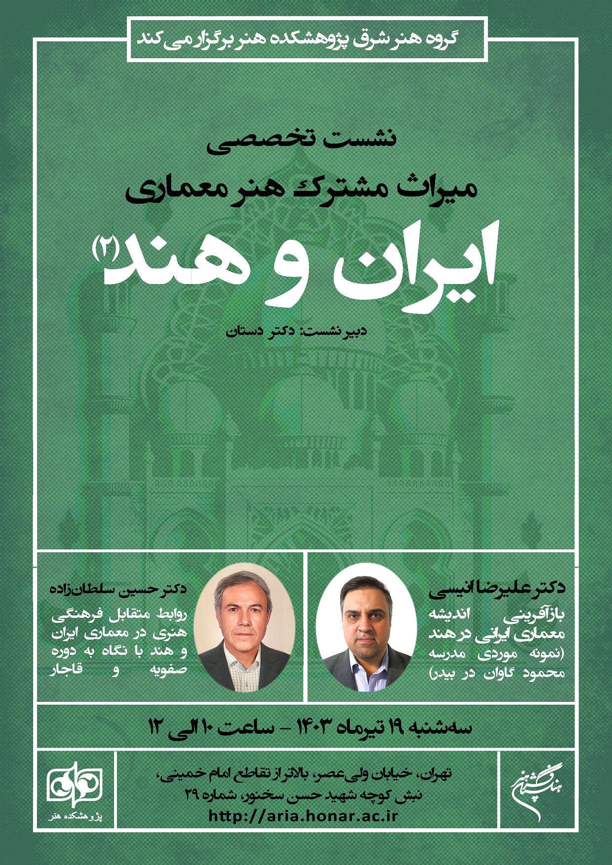 به گزارشگالري آنلاينبه نقل از روابط عمومي پژوهشکده هنر، گروه پژوهشي هنر شرق، دومين نشست تخصصي «ميراث مشترک هنرمعماري ايران و هند» راسهشنبه 19 تيربرگزار ميکند. در اين نشست تخصصي که نسرين دستان دبيري آن را برعهده دارد،، عليرضا انيسي، با موضوع «بازآفريني انديشه معماري ايراني در هند (نمونه موردي مدرسه محمود گاوان در بيدر)»، حسين سلطانزاده،با موضوع «روابط متقابل فرهنگي هنري در معماري ايران و هند با نگاه به دوره صفويه و قاجار» سخنراني ميکنند.