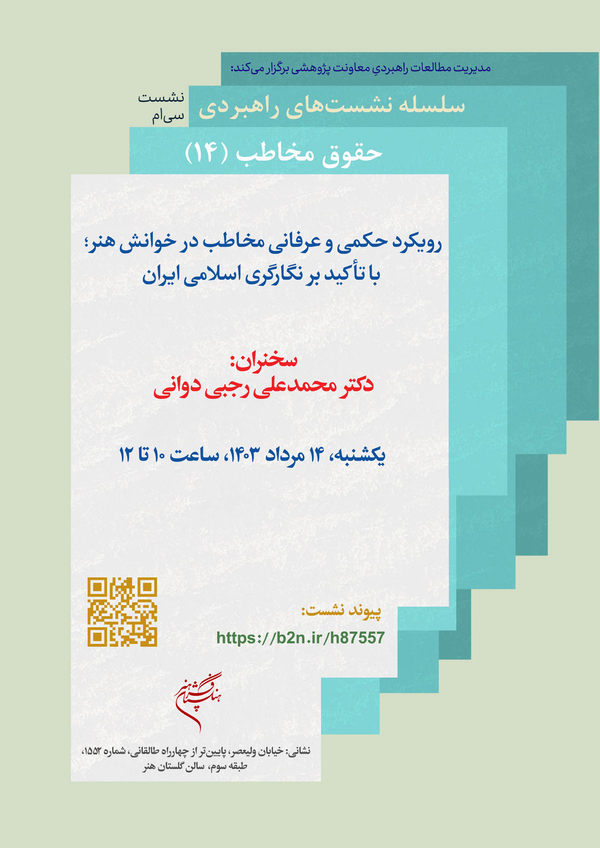 به گزارش گالري آنلاين به نقل از روابطعمومي فرهنگستان هنر، سيامين نشست از سلسله نشستهاي راهبردي با موضوع حقوق مخاطب به بررسي«رويكرد حكمي و عرفاني مخاطب در خوانش هنر؛ با تأكيد بر نگارگري اسلامي ايران» اختصاص دارد که در آن محمدعلي رجبيدواني، عضو پيوسته و رئيس گروه تخصصي هنرهاي سنتي و صنايع دستي فرهنگستان هنر به سخنراني ميپردازد.