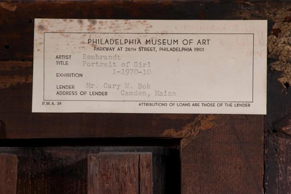 در حالي که سبک اثر، بهويژه استفاده برجسته از نور، واقعاً سبک رمبرانت را تداعي ميکند، افشاگري واقعي در پشت تابلو است—که برگهاي از موزه هنر فيلادلفيا را نشان ميدهد که ثبت کرده است آقاي «کري دبليو بوک»، يکي از نوادگان مرحوم خانواده ثروتمند بوک از شرکت نشر Curtis در فيلادلفيا، اين اثر را در سال ۱۹۷۰ به اين موزه قرض داده است. برگه مذکور، نقاشي را به رمبرانت نسبت داده و آن را «پرتره دختر» ناميده است. هرچند اين برگه همچنين اشاره ميکند که بوک اهل کمدن بوده، اما مشخص نيست که آيا خانوادهاش اين پرتره را براي فروش عرضه کردهاند يا خير. وييِو قول داده که هويت فروشنده را فاش نکند.