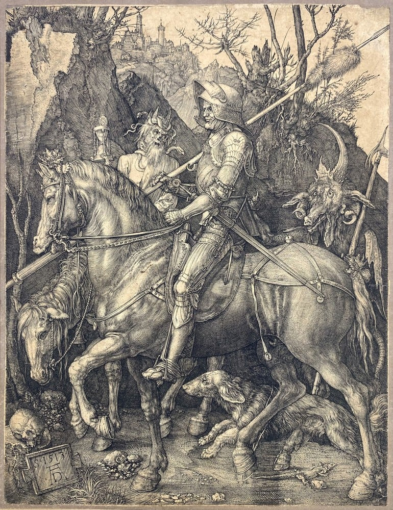 کارشناسان با مقايسه اين چاپ با سه اثر مشابه در مجموعه «موزه بريتانيا» به اين نتيجه رسيدند که نام اين اثر هنري «شواليه، مرگ و شيطان» (۱۵۱۳)‌ است.