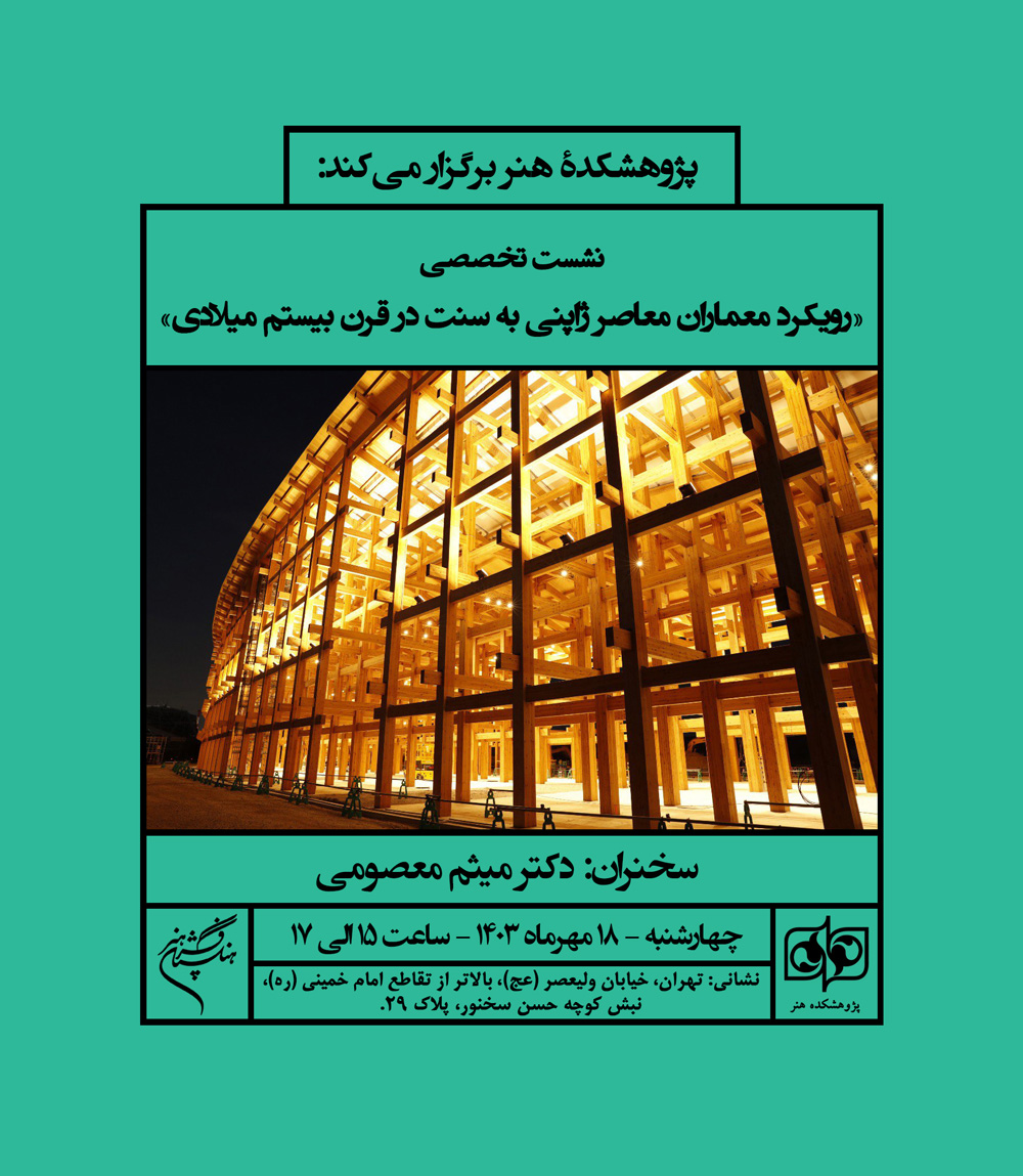 نشست تخصصي «رويکرد معماران معاصر ژاپني به سنت در قرن بيستم ميلادي»، چهارشنبه 18 مهرماه 1403 ساعت 15 تا 17 به صورت حضوري برگزار ميشود. علاقهمندان براي حضور در اين نشست ميتوانند به نشاني تهران، خيابان وليعصر، بالاتر از چهارراه امام خميني، نبش کوچه شهيد حسن سخنور، پلاک29، پژوهشکده هنر مراجعه نمايند.