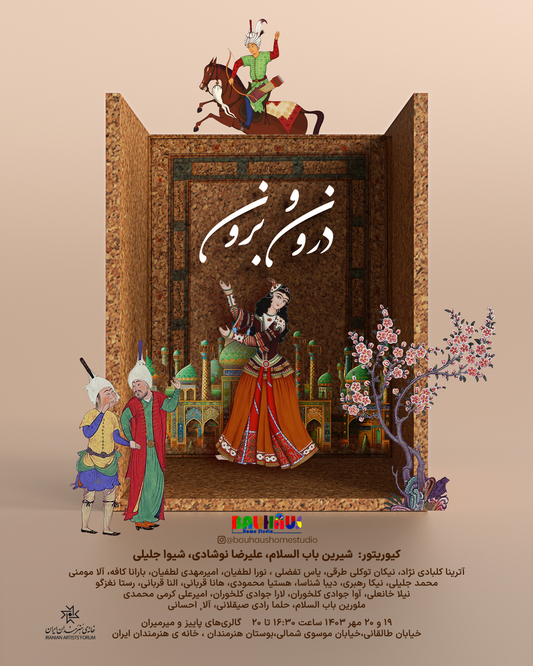 نمايشگاه "درون و برون" بازتاب سفري است که از آگاهي و شناخت جهان بيروني، تاريخ و فرهنگ آغاز ميشود و با دروني سازي آن به عنوان بخشي از هويت فردي ادامه مي يابد. در اينجا، هنر به عنوان ابزاري براي پيوند اين دو جهان عمل کرده و هر اثر نشان دهنده ي ارتباط عميق ميان درون فرد و گذشته و فرهنگ ايران است. اين آثار تجسمي از همزيستي ميان ظاهر و باطن، درون و برون و تلاشي براي بازگرداندن ارزشهاي فرهنگي به زندگي روزمره و ذهن معاصر هستند.