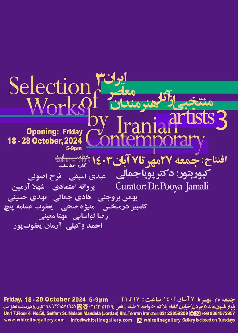 نمايشگاه گروهي تحت عنوان "منتخبي از آثار هنرمندان معاصر ايران ۳" به کيوريتوري دکتر پويا جمالي از روز جمعه 27 مهرماه در گالري خط سفيد برپا مي شود.