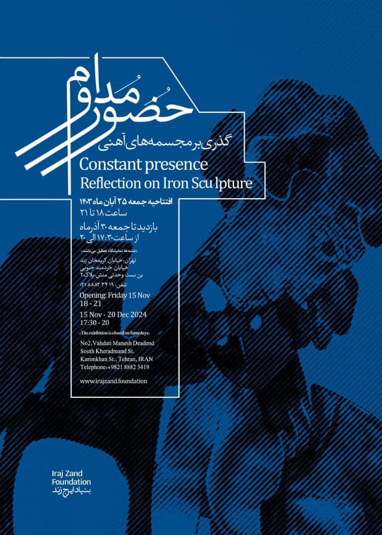 نمايشگاه حضور مداوم ”گذري بر مجسمههاي آهني” از جمعه 25 آبان ماه در بنياد ايرج زند برپا شده و تا 30 آذرماه نيز ادامه خواهد داشت.