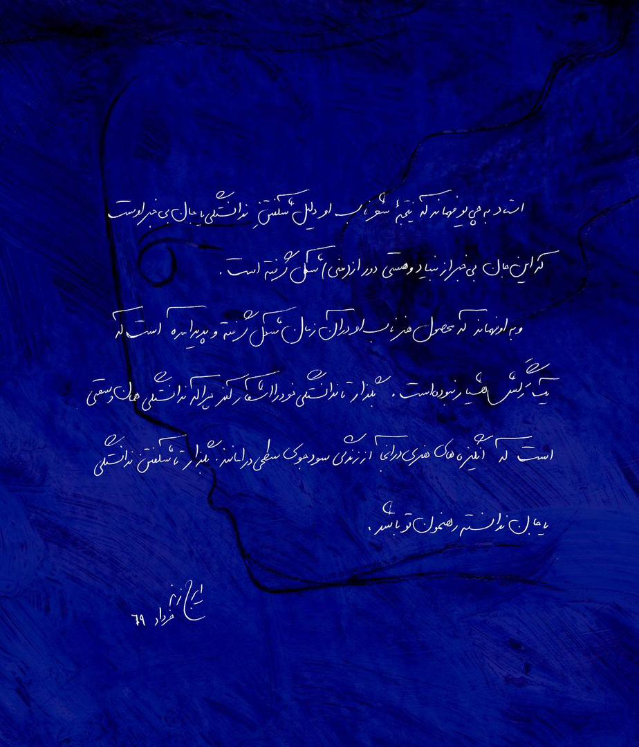 در جستجوي حضور… حضوري که با هر نگاه گوشه ايي از اسرار درون را عيان مي کند. هنري که وراي فرم و نقش، جاني عميق و آرام دارد. هر قطعه از آثار او، ردي از زندگي و نغمه ايي از حضور است. گويي با هر ضربه و هر نقش، سفري را به درون خود آغاز کرده… سفري که در آن هنرش از جنس زمان است و بي پايان.