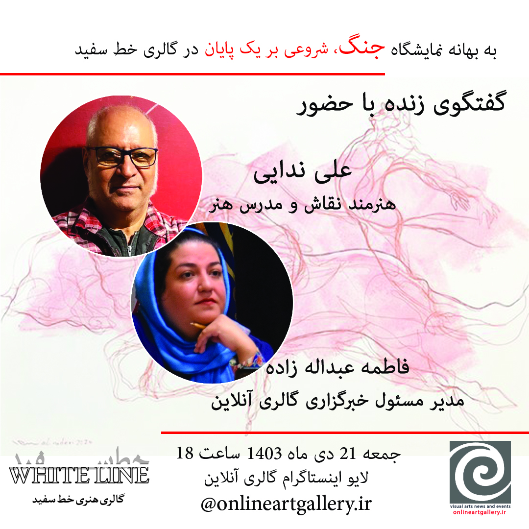 جمعه ۲۱ دي‌ماه ۱۴۰۳، ساعت ۱۸ به وقت ايران، علي ندايي، نقاش برجسته معاصر، در يک گفتگوي زنده با فاطمه عبدالله‌زاده، مديرمسئول خبرگزاري گالري آنلاين، به بررسي نمايشگاه اخير خود در گالري خط سفيد خواهد پرداخت.