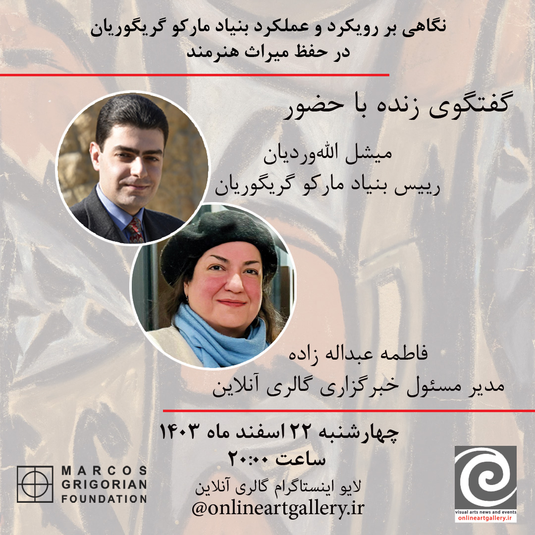 گفتگويي زنده با ميشل الله‌ورديان، رئيس بنياد مارکو گريگوريان، درباره رويکرد و عملکرد اين بنياد در حفظ ميراث هنري اين هنرمند برگزار خواهد شد.
