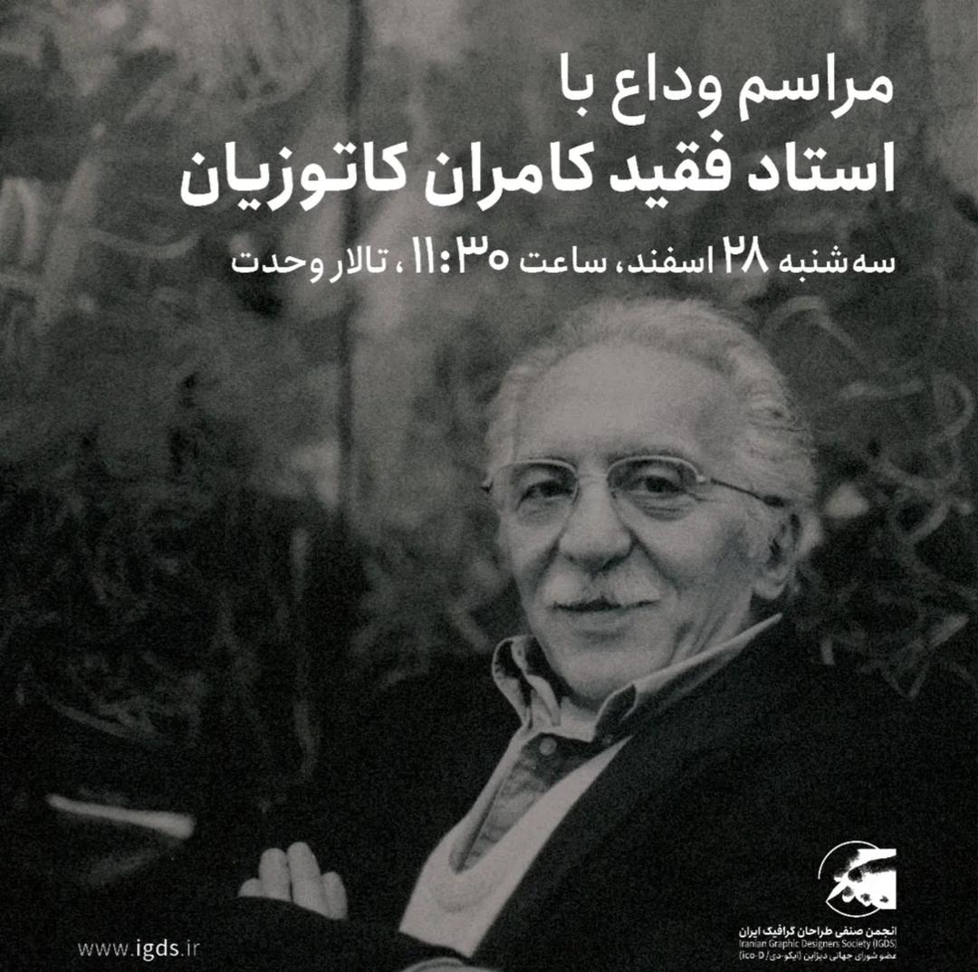 مراسم وداع با استاد فقيد، کامران کاتوزيان ساعت 11:30 روز سه شنبه 28 اسفندماه در تالار وحدت برگزار مي شود.