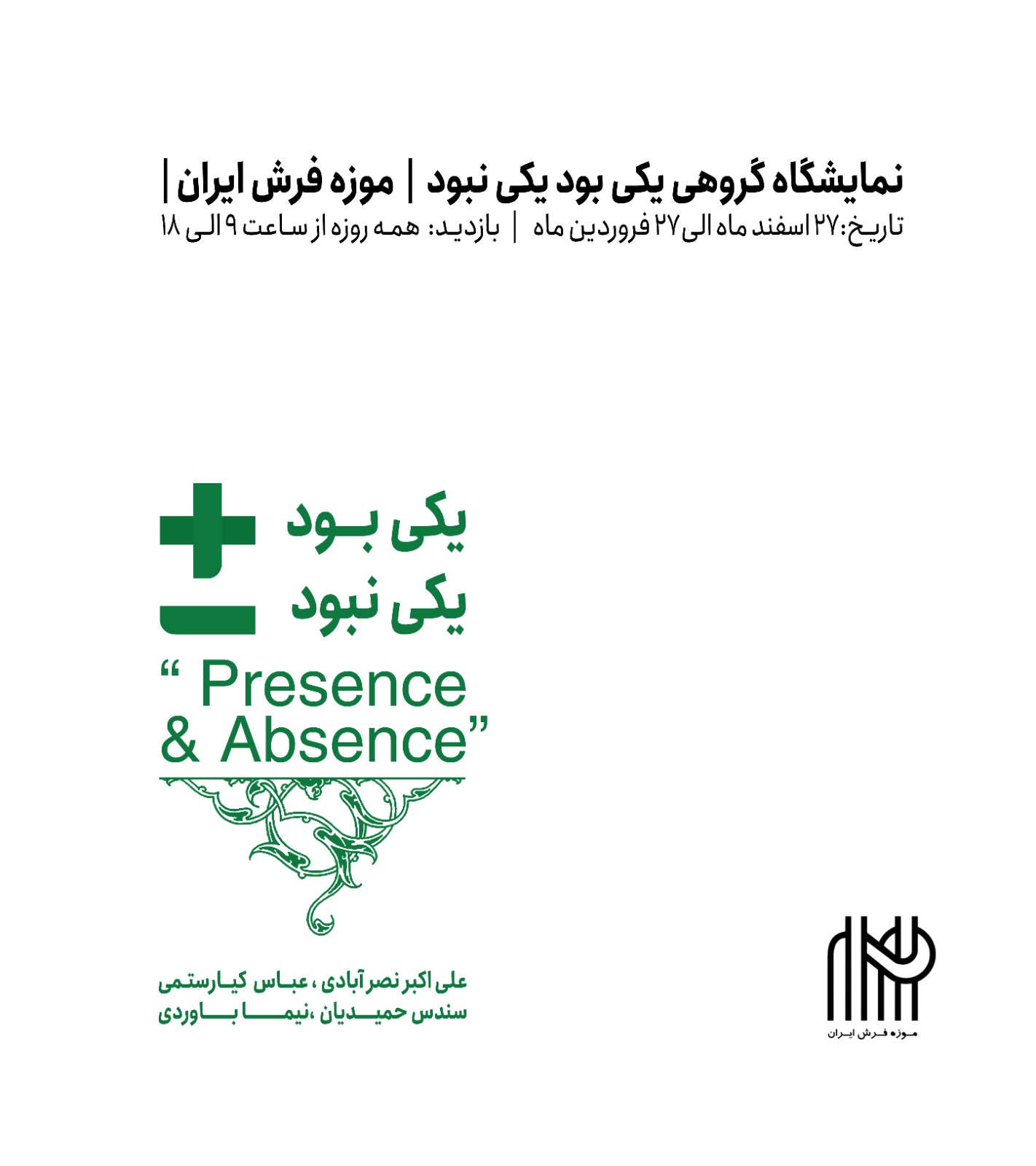 به گزارش گالري آنلاين، نمايشگاه «يکي بود، يکي نبود» از ۲۷ اسفند در موزه فرش تهران افتتاح شده و ميزبان آثاري از علياکبر نصرآبادي، سندس حميديان، عباس کيارستمي و نيما باوردي است. اين نمايشگاه، با تمرکز بر دوگانگيهاي فلسفي همچون بودن و نبودن، حضور و غياب، و ماندگاري در دل فراموشي، ديالوگي ميان مديومهاي مختلف هنري ايجاد کرده است.