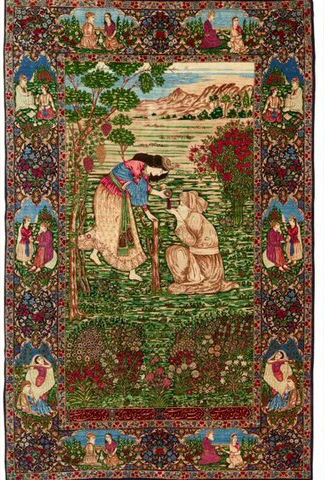 داستان «شيخ صنعان و دختر ترسا» از مشهورترين داستانهاي ادبي ايران است که عطار، شاعر پُرآوازه ايران، آن را روايت ميکند. اين داستان در ۱۰۰ سال گذشته، بارها مورد توجه هنرمندان فرش کرمان بوده است و نمونههاي متعددي ازآن را بافتهاند، به نحوي که گروهي مستقل از قاليچههاي تصويري کرمان به اين طرح اختصاص يافته است.