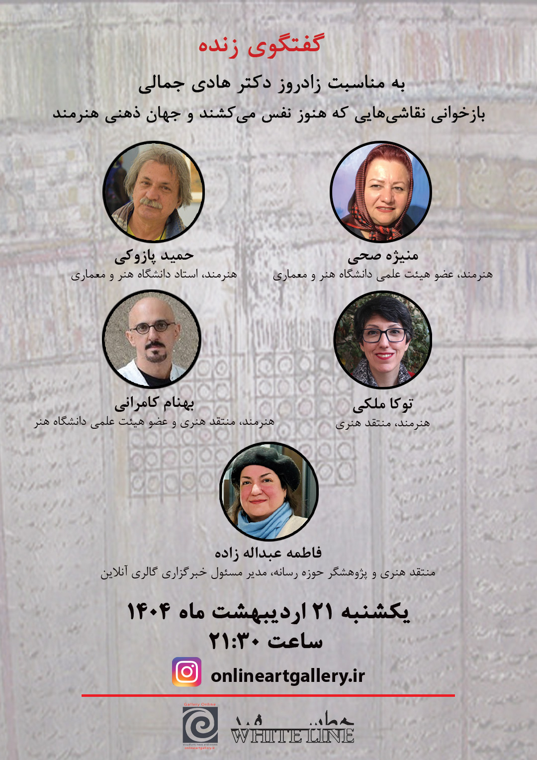 در گراميداشت زادروز هنرمند فقيد، دکتر هادي جمالي — نقاش، معمار و مدرس برجسته معاصر — گفتوگويي زنده با حضور جمعي از هنرمندان و منتقدان شناختهشده برگزار خواهد شد. در اين نشست، آثار و انديشههاي هنري هادي جمالي از منظر زيباييشناختي، تاريخي و شخصي مورد تحليل و بازخواني قرار ميگيرد.