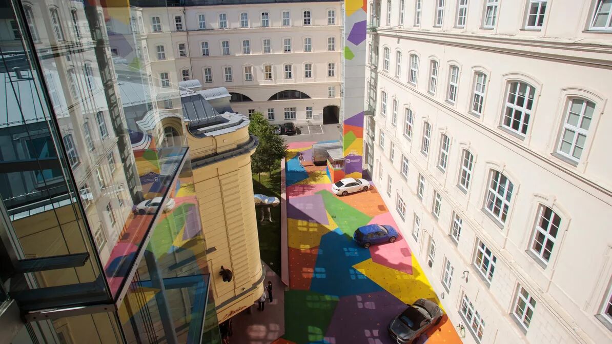 يک هنرمند اتريشي براي مقابله با موج گرماي تابستاني که اروپا را در برگرفته، آسفالت حياط موزهاي در وين را به رنگهاي مختلف درآورد.