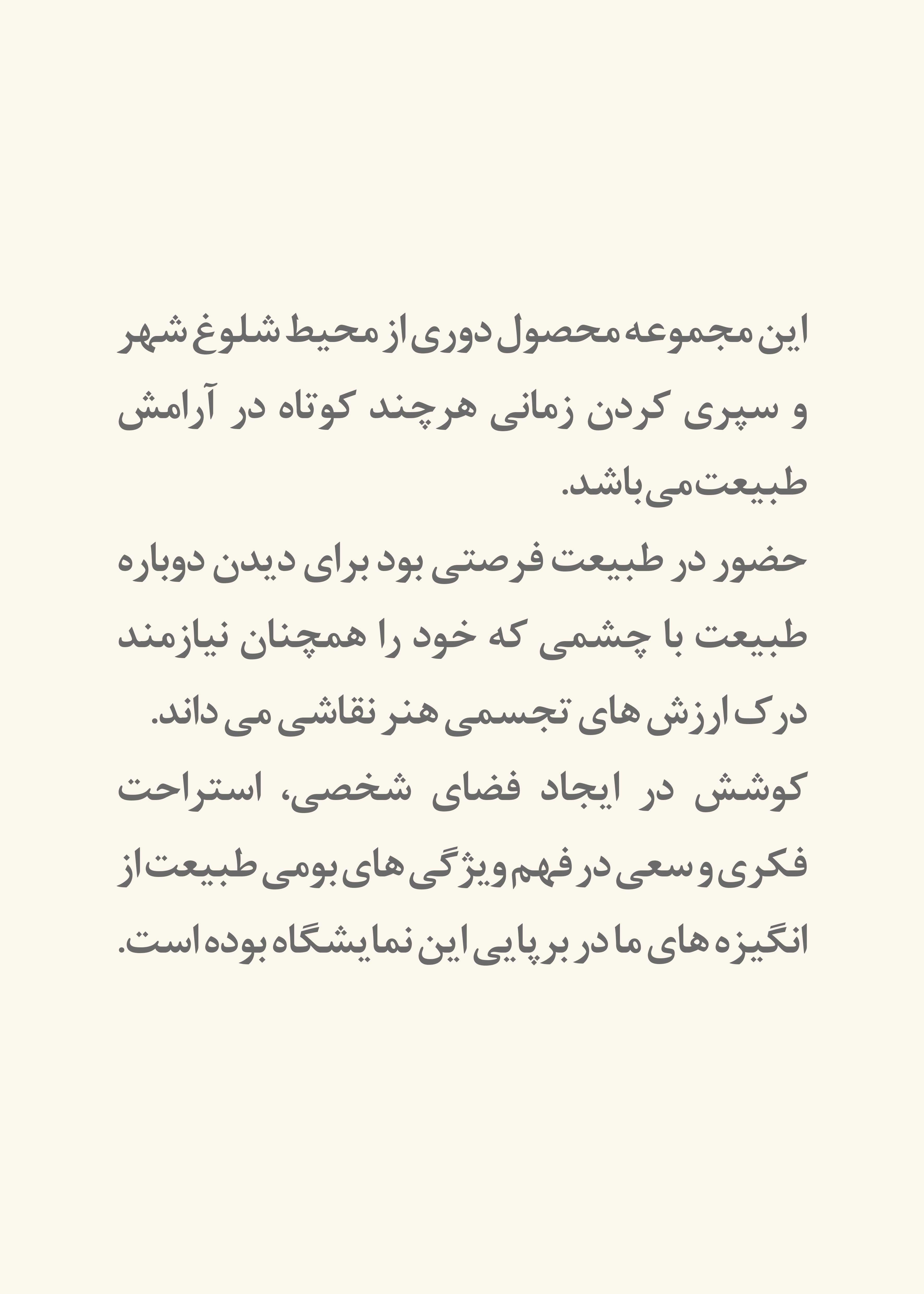 مجموعه آثار اين نمايشگاه، محصول دوري از محيط شلوغ شهر و سپري کردن زماني هرچند کوتاه در آرامش طبيعت است.