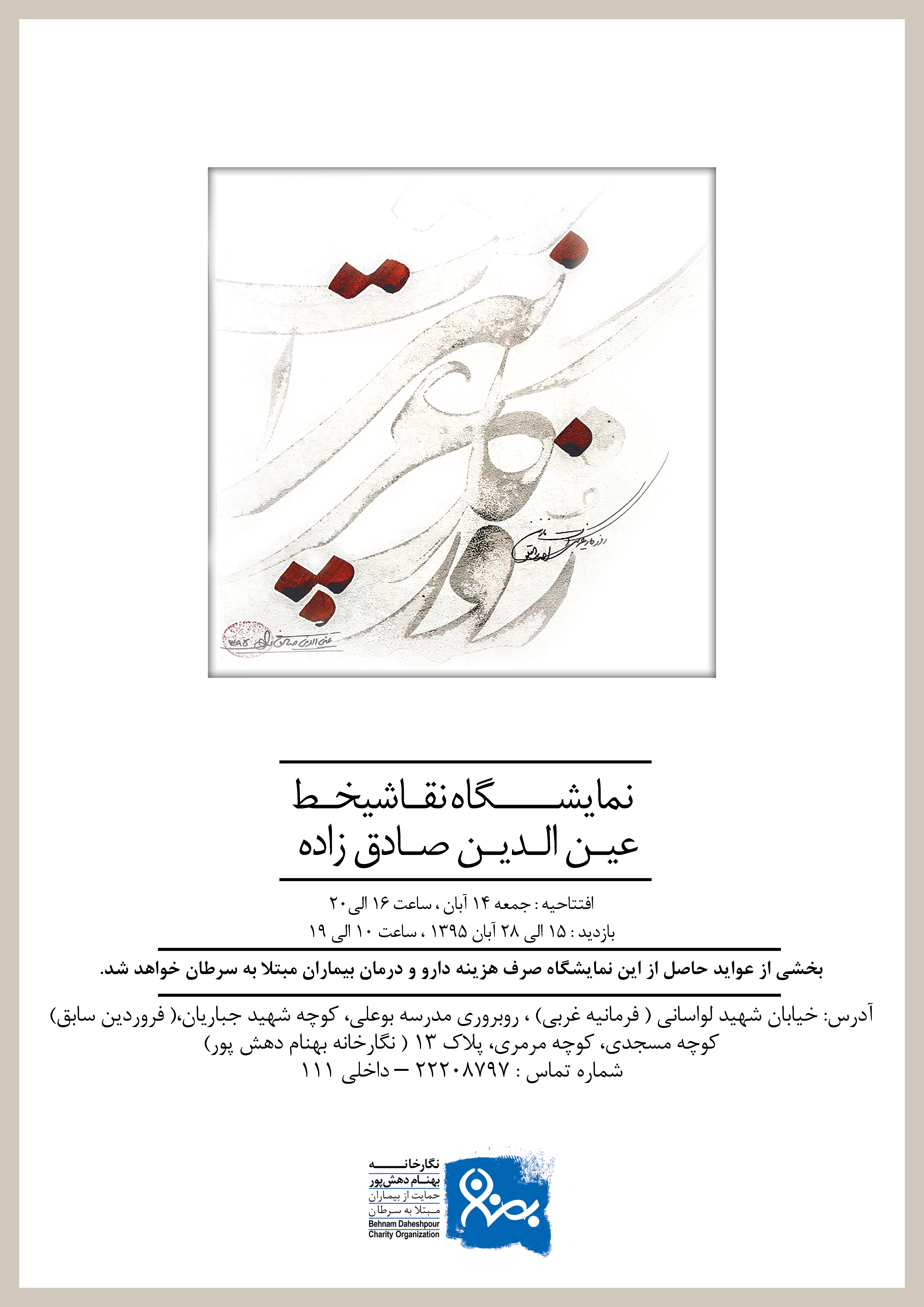 نمايشگاه نقاشيخط استاد عين الدين صادق زاده روز جمعه 14 آبان ماه 1395 در نگارخانه موسسه خيريه بهنام دهشپور گشايش مييابد. تعداد آثار او در اين نمايشگاه 40 اثر با تکنيک "ترکيب مواد" است.