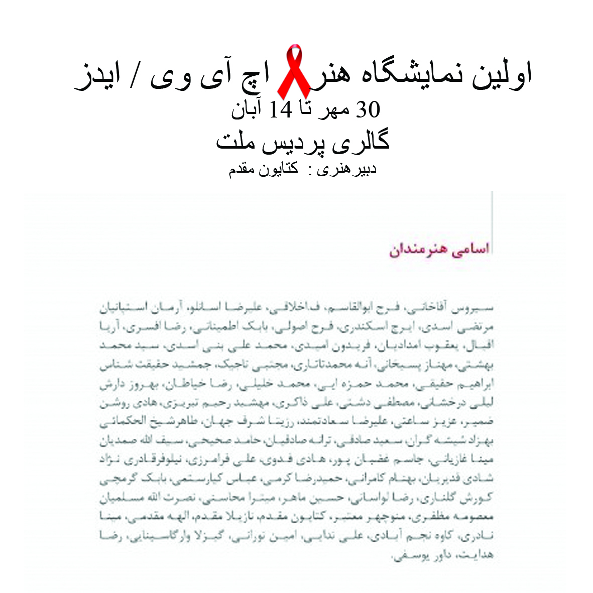 نخستين نمايشگاه «هنر و اچ آي وي/ ايدز» نيز با دبيري هنري «کتايون مقدم» و با اثري از زندهياد «عباس کيارستمي» و ديگر هنرمندان سرشناس حوزه هنرهاي تجسمي ايران و با حمايت از کودکان مبتلا به اچآيوي/ ايدز، روز جمعه ۳۰ مهر ماه جاري با حمايت هنرمندان سرشناس حوزه هنرهاي تجسمي کشور و مردم از کودکان مبتلا به اچآيوي/ ايدز، در گالري پرديس سينمايي ملت تهران افتتاح ميشود و تا روز 14 آبان ماه امسال ادامه خواهد داشت.