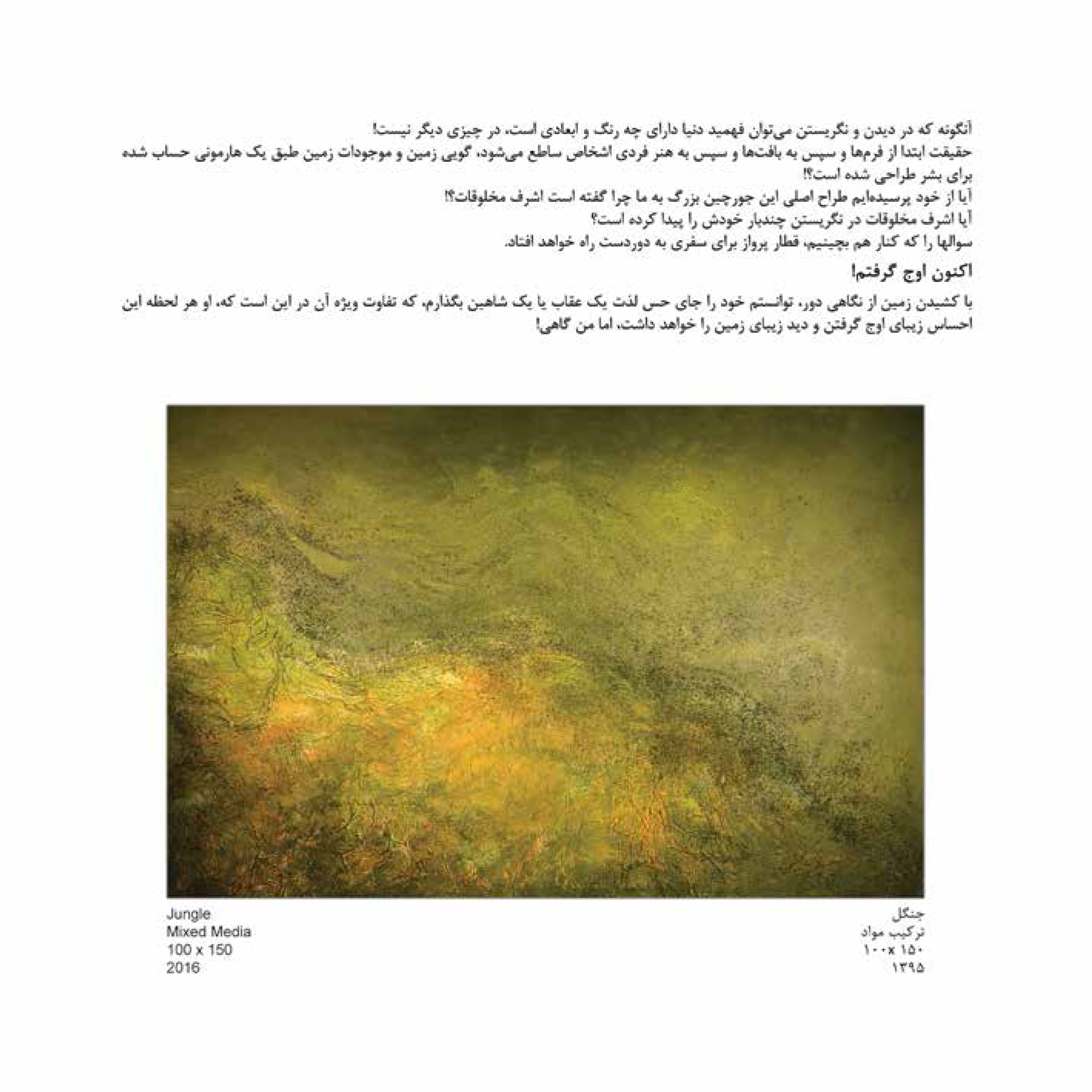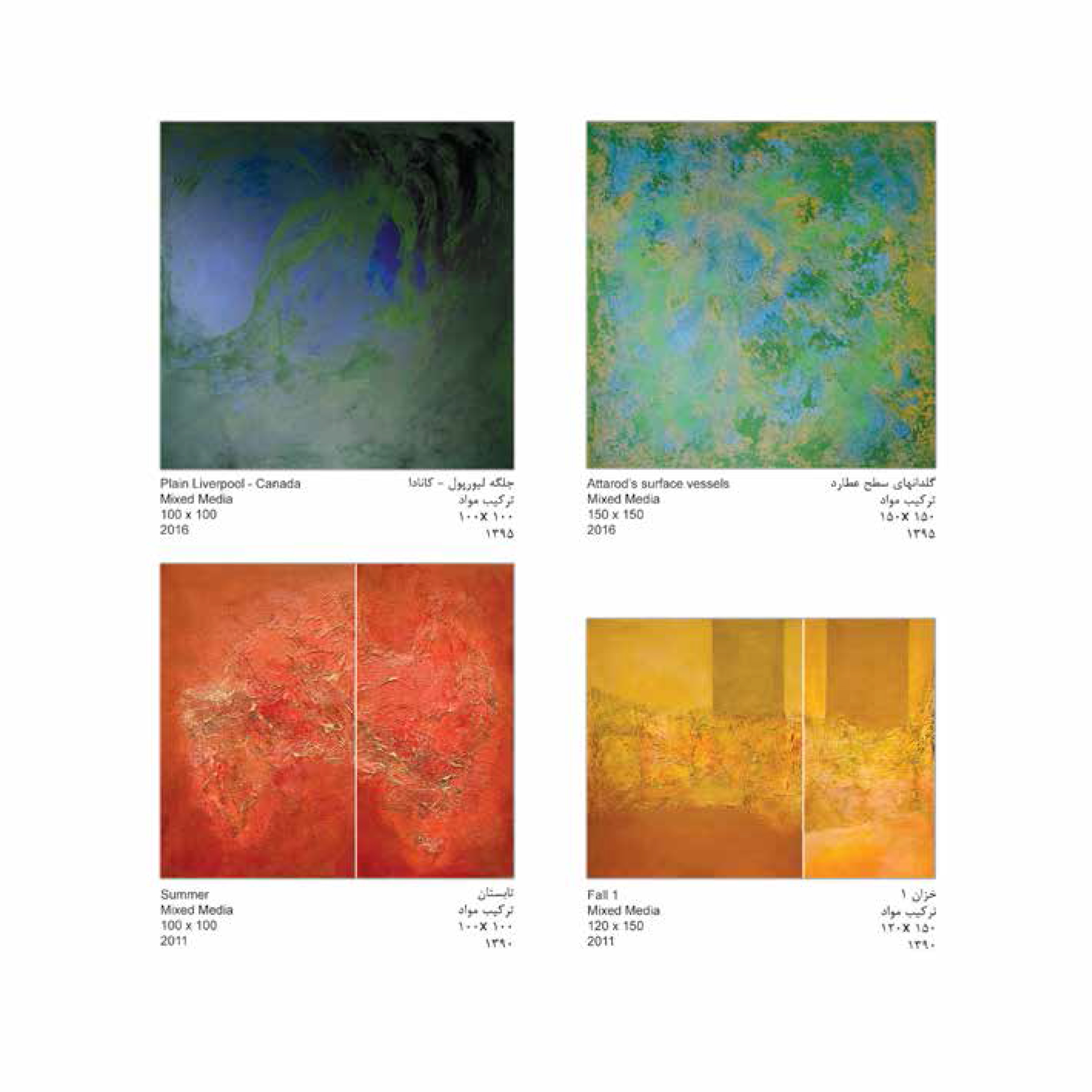 بخش هايي از آثار جزئياتي از زمين را نمايش مي دهد که رنگ آن صرفا بر اساس حس من نسبت به فصل ها انتخاب شده است و دقيقا حقيقت طبيعت نيست.