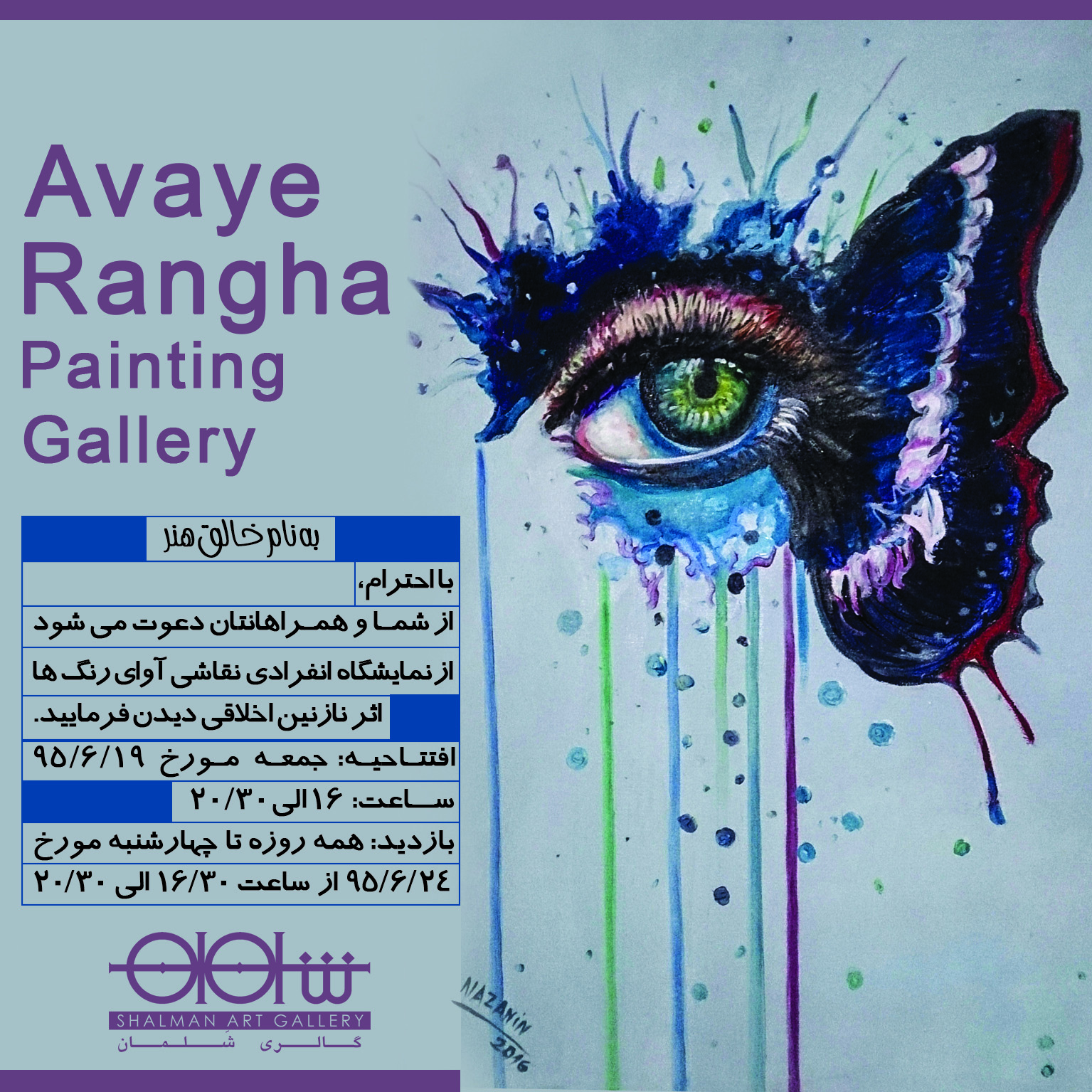 به گزارش گالري آنلاين گالري شَلمان از روز جمعه نوزدهم شهريور ماه از ساعت 16 الي 20:30 ميزبان آثار نارنين اخلاقي تحت عنوان " آواي رنگ ها" خواهد بود. اين نمايشگاه تا روز چهارشنبه 24 شهريور ادامه خواهد داشت و علاقه مندان ميتوانند همه روزه از ساعت 16:30 تا 20:30 به آدرس ميرداماد، نرسيده به شريعتي، رودبارغربي (جنوبي)، کوچه کاووسي، پلاک 27 مراجعه نمايند.