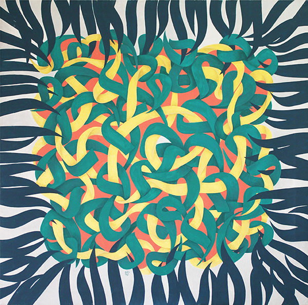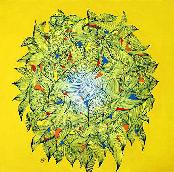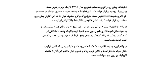 حس و حال خوشنويسي ايراني و همچنين خط ثلث در آثارم کاملا مشهود است و آثار اين مجموعه برداشتي است کاملا شخصي از خوشنويسي و گرافيک و رنگ.