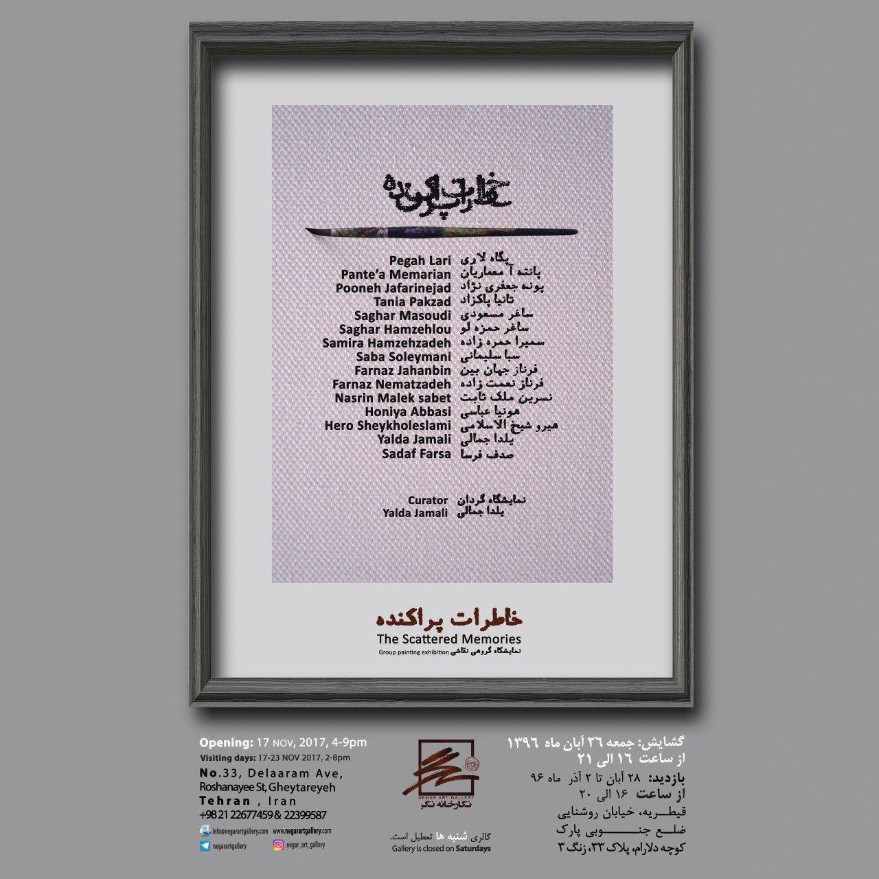 به گزارش گالري آنلاين، نمايشگاه گروهي تحت عنوان "خاطرات پراکنده" به نمايشگاه گرداني يلدا جمالي از روز جمعه بيست و ششم آبان ماه در گالري نگر برپا مي شود.