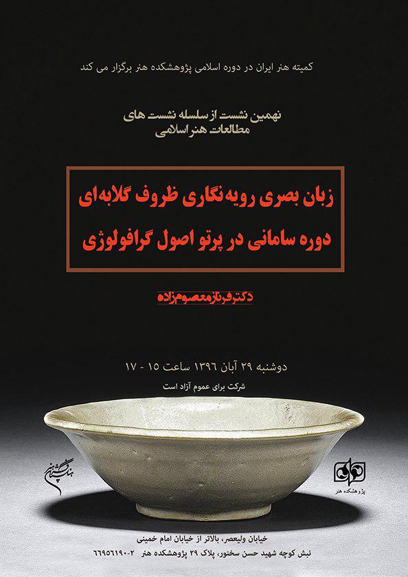 نهمين نشست از سلسله نشست هاي مطالعات هنر اسلامي با موضوع « زبان بصري رويه نگاري ظروف گلابه ‌اي دوره ساماني در پرتو اصول گرافولوژي»  در پژوهشكده هنر برگزار مي‌شود.