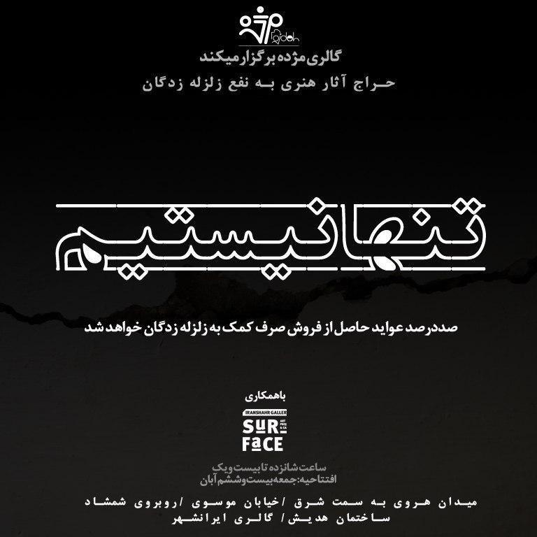 "تنها نيستيم" نمايشگاه خيريه آثار هنري به نفع زلزلهزدگان استان کرمانشاه که به همت گالري مژده و همکاري گالري ايرانشهر و جمعي از هنرمندان عرصه هنرهاي تجسمي تدارک ديده شده، شب گذشته 26 آبان ماه در ساختمان هديش آغاز و در اولين روز 110 ميليون تومان فروش داشت.