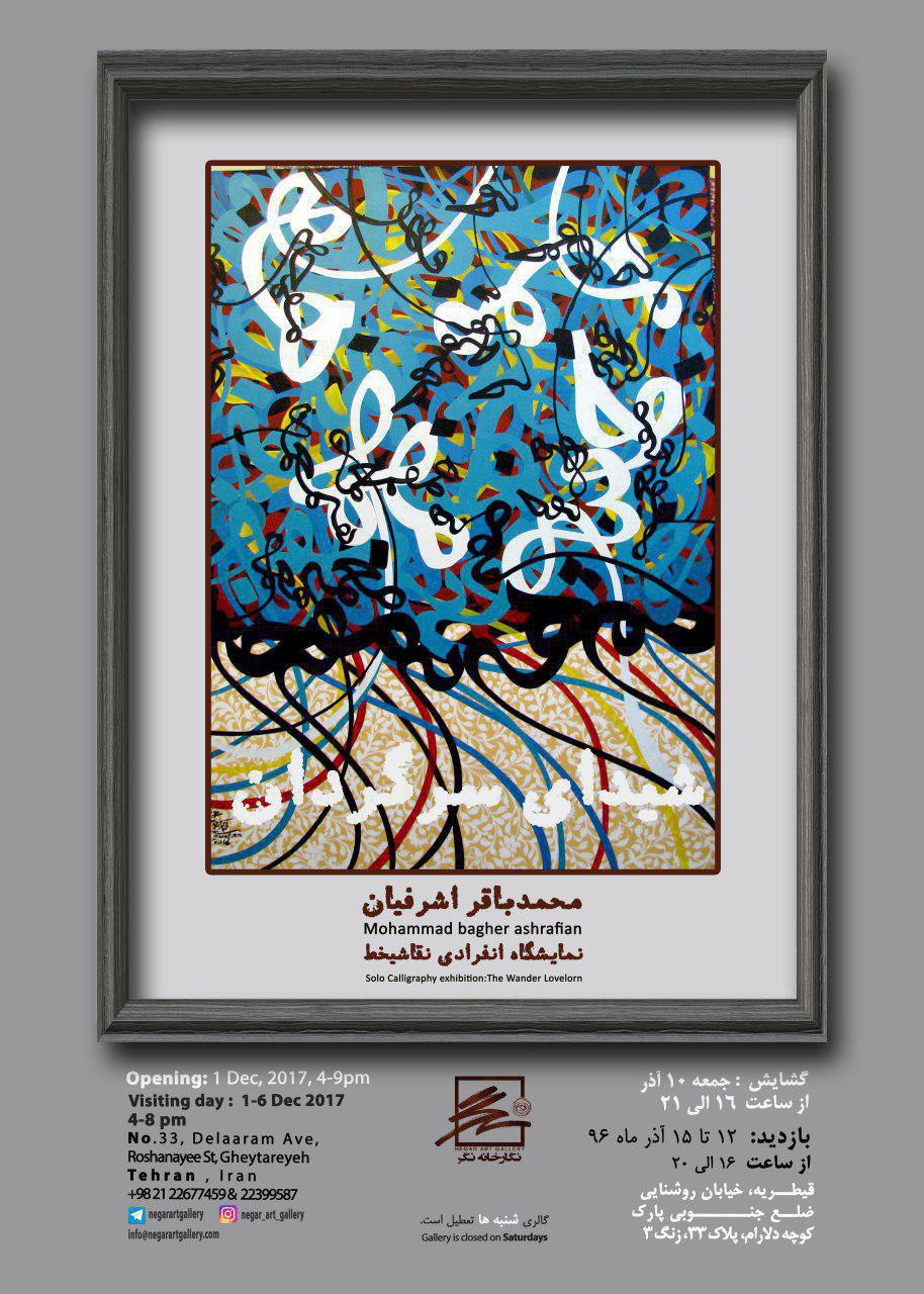 به گزارش گالري آنلاين، نمايشگاهي از آثار نقاشيخط محمدباقر اشرفيان تحت عنوان "شيداي سرگردان" از روز جمعه دهم آذرماه در گالري نگر برپا مي شود.