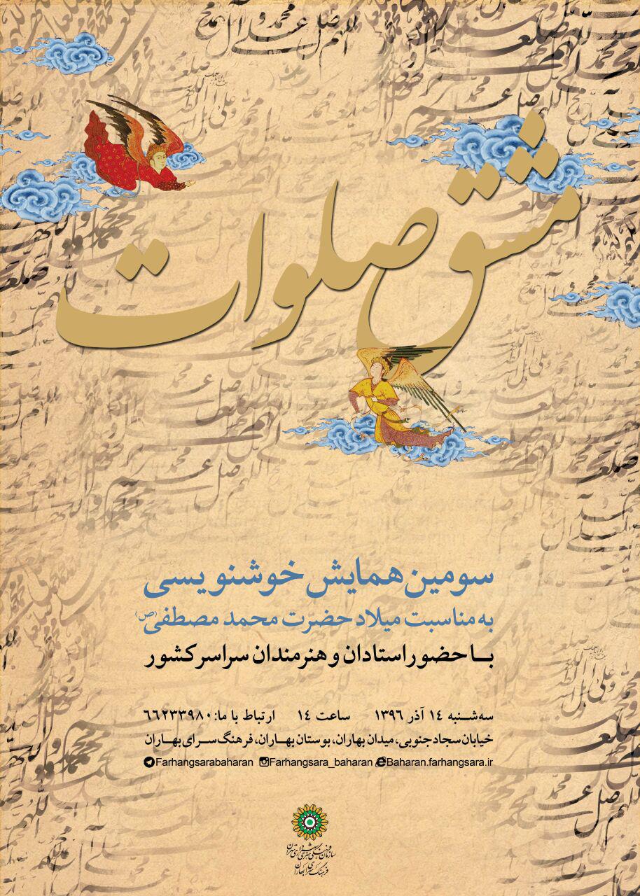 به گزارش گالري آنلاين به نقل از روابط عمومي همايش، سومين همايش خوشنويسي "مشق صلوات" با هدف افزايش سطح معنويت در جامعه از طريق يادآوري ذکر صلوات، ايجاد بستري مناسب براي انديشيدن و تعمق جامعه هنري کشور به ابعاد شخصيتي پيامبر اکرم (ص) و خلق آثار هنري به منظور پاسداشت معنا و مفهوم ذکر صلوات همزمان با سالروز ميلاد حضرت محمد مصطفي (ص) سهشنبه ۱۴ آذر از ساعت ۱۴ تا ۱۷ در فرهنگسراي بهاران برگزار ميشود.