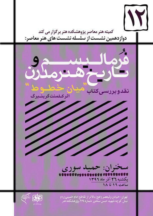 دوازدهمين نشست از سلسله نشستهاي «هنر معاصر» با عنوان «فرماليسم و تاريخ هنر مدرن؛ نقدو بررسي كتاب «ميان خطوط» اثر كلمنت گرينبرگ» در پژوهشكده هنر برگزار ميشود.