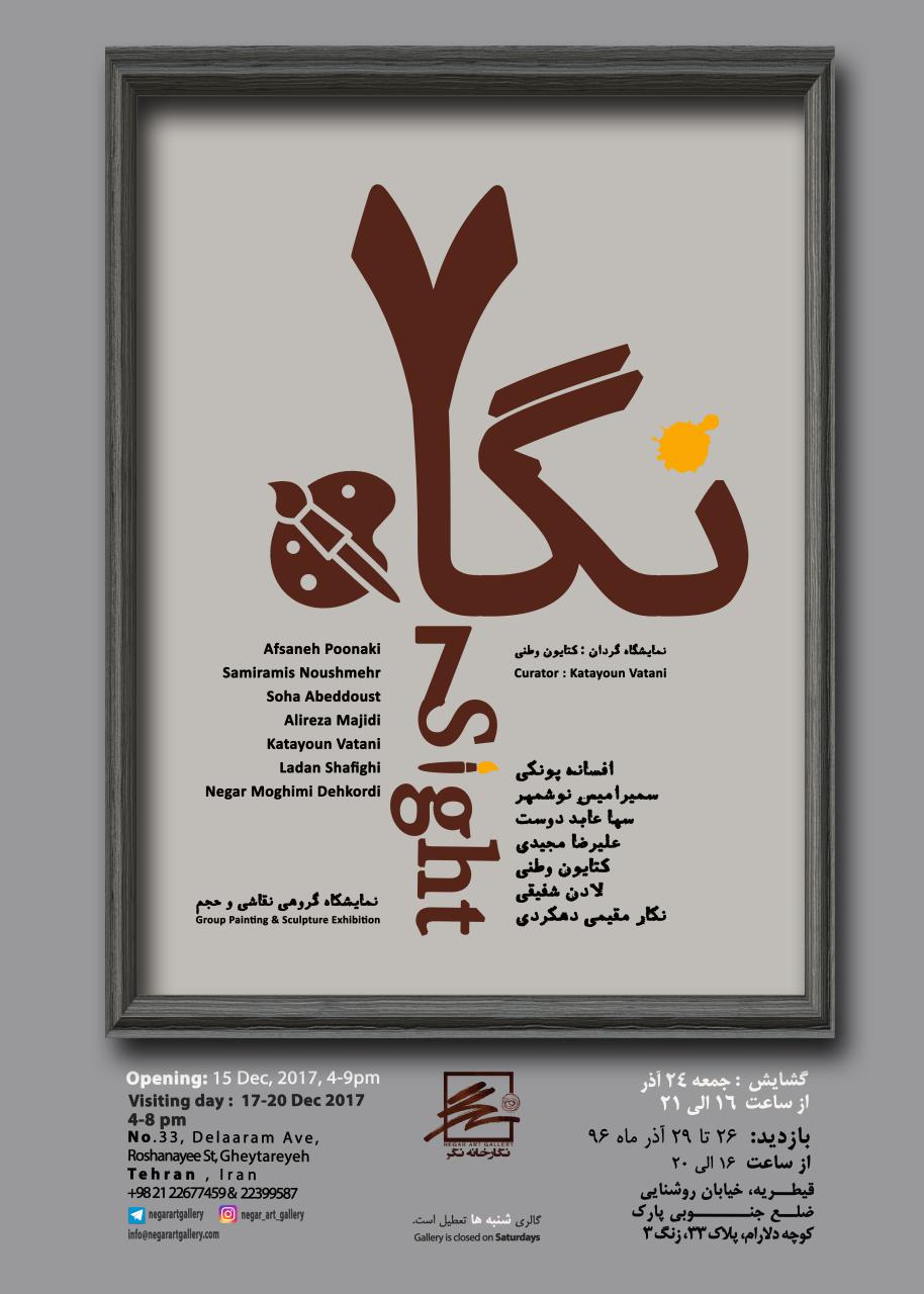 اين نمايشگاه که شامل آثاري از افسانه پونکي، سميرا ميس نوشمهر، سها عابد دوست، عليرضا مجيدي، کتايون وطني، لادن شفيقي، نگار مقيمي دهکردي مي باشد تا بيست و نهم آذرماه در گالري نگر به نشاني قيطريه، خيابان روشنايي، کوچه دلارام، پلاک 33 داير خواهد بود.