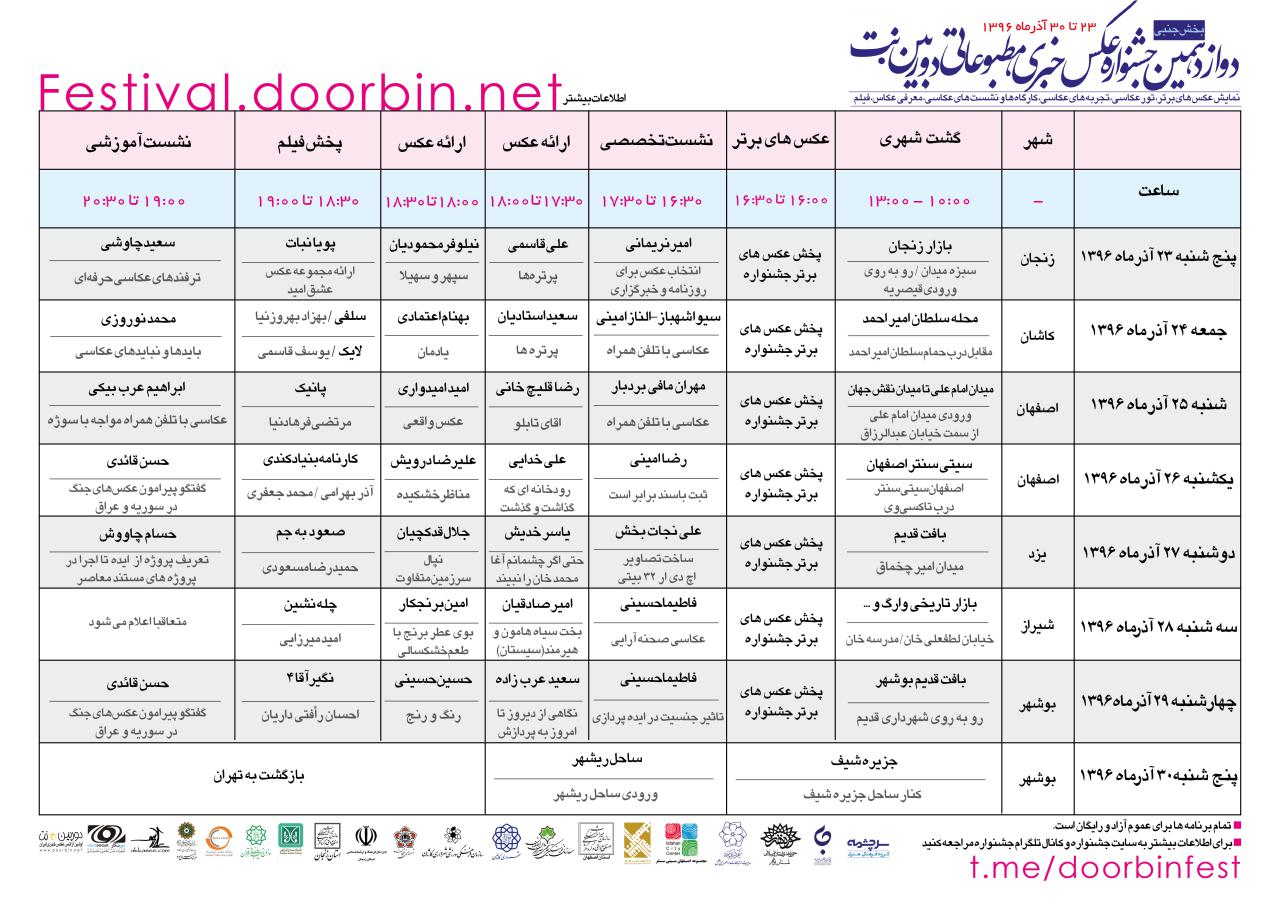 برنامه ها از ٢٣ آذر در زنجان، ٢٤ آذر كاشان، ٢٥ و ٢٦ آذر اصفهان، ٢٧ آذر يزد، ٢٨ آذر شيراز، ٢٩ و ٣٠ آذر بوشهر از ساعت ١١ تا٢١ طبق جدول برنامه ريزي اجرا خواهد شد.