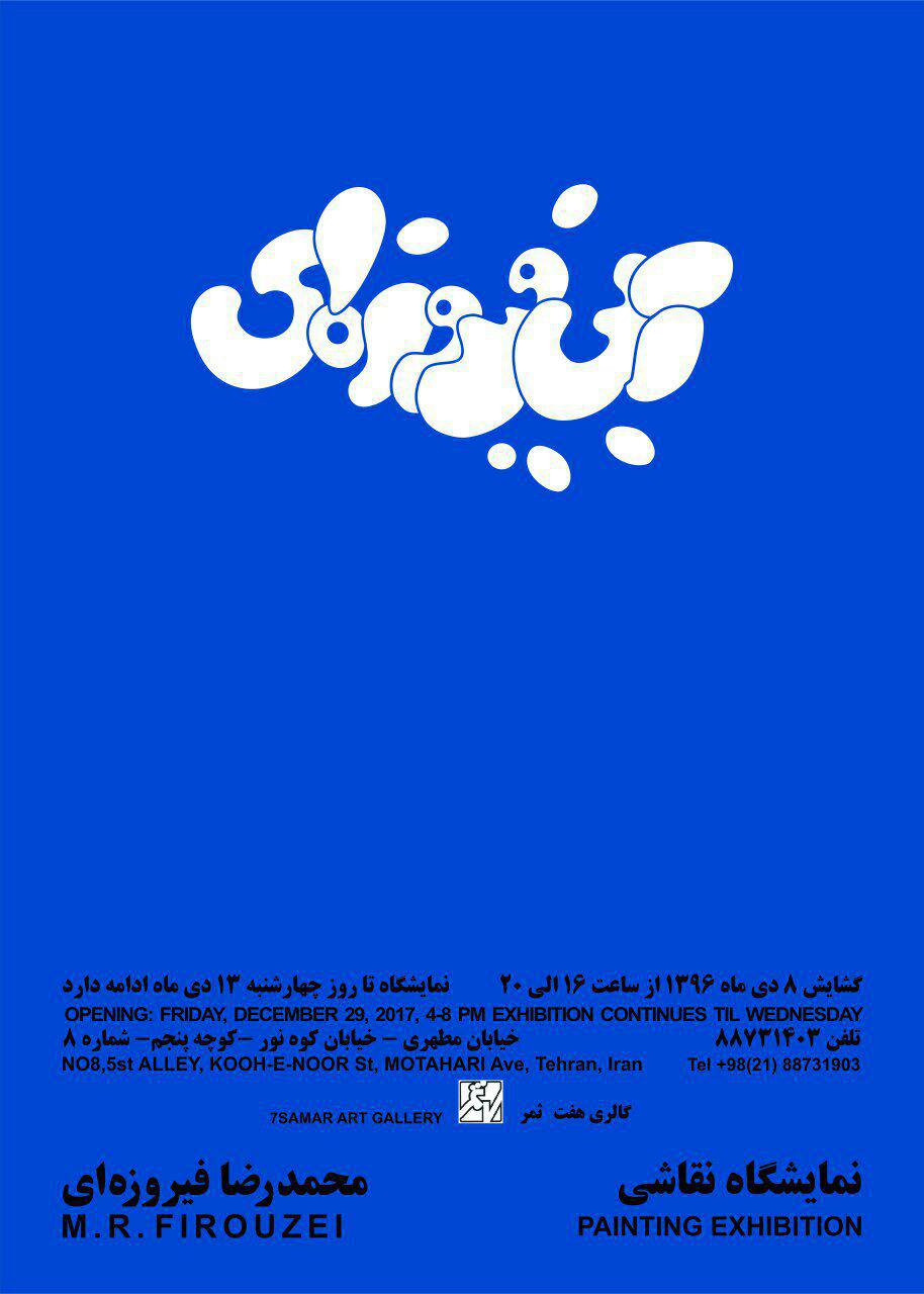 به گزارش گالري آنلاين، نقاشي هاي محمدرضا فيروزه اي تحت عنوان "آبي فيروزه اي" از روز جمعه هشتم دي ماه در گالري هفت ثمر به نمايش در مي آيد.