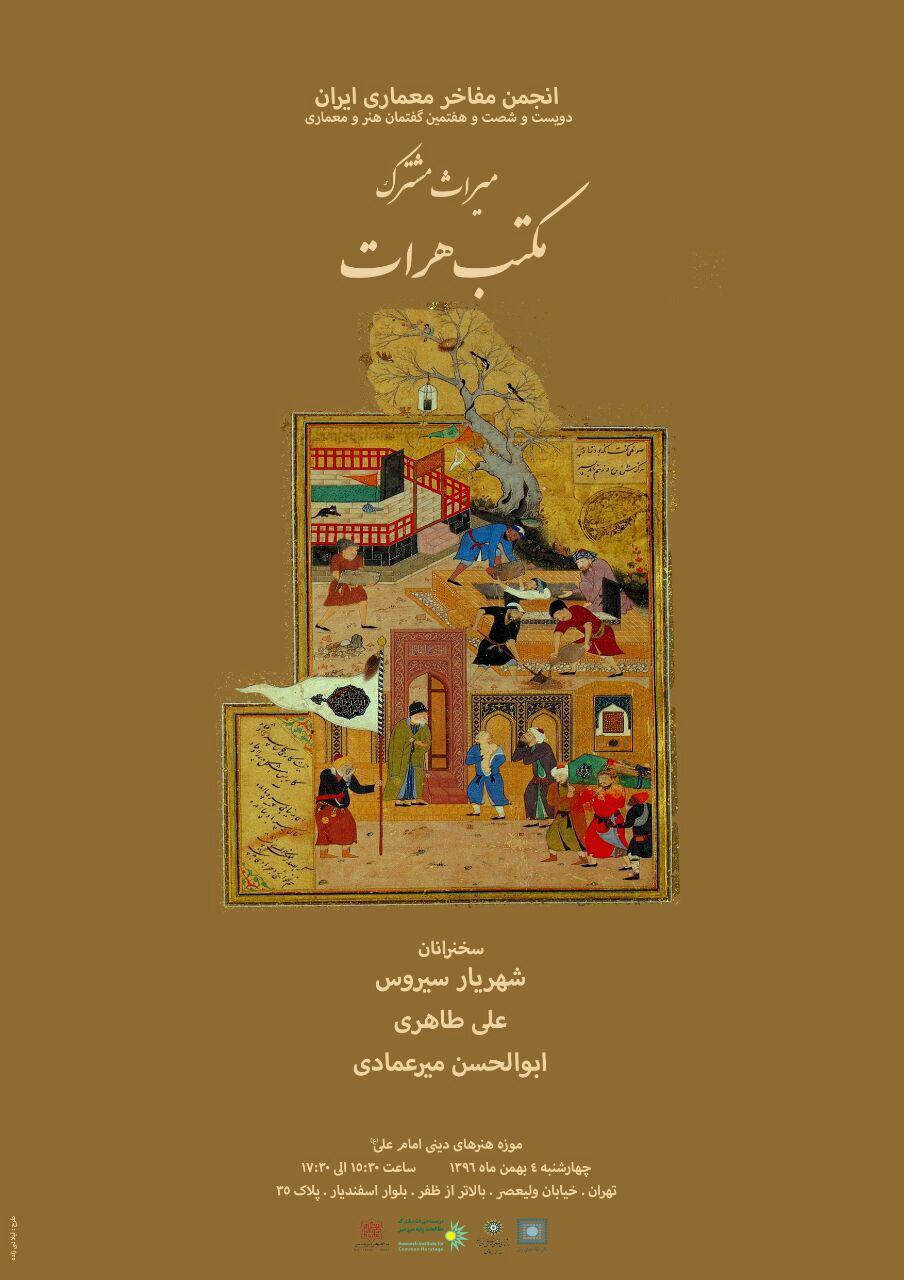 به گزارش گالري آنلاين به نقل از انجمن مفاخر معماري ايران، در دويست و شصت و هفتمين گفتمان هنر و معماري که به معرفي مکتب هرات اختصاص دارد آقايان شهريار سيروس، علي طاهري وابوالحسن ميرعمادي سخن خواهند گفت که با نمايش فيلم همراه است.
