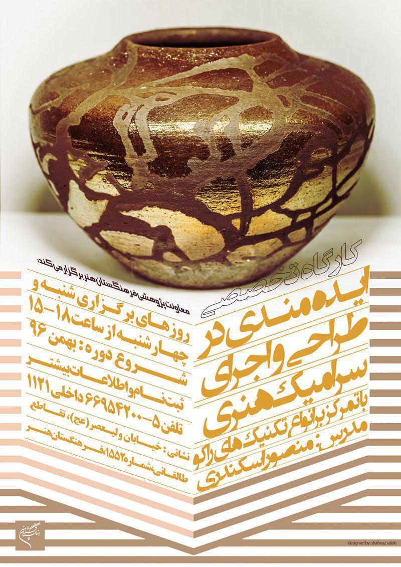 به گزارش گالري آنلاين به نقل از روابط عمومي فرهنگستان هنر، کارگاه تخصصي «ايدهمندي در طراحي و اجراي سراميک هنري» با تمرکز بر انواع تکنيکهاي راکو، زير نظر استاد منصور اسکندري بهمن ماه 1396، روزهاي شنبه و چهارشنبه از ساعت 15 تا 18 برگزار ميشود.