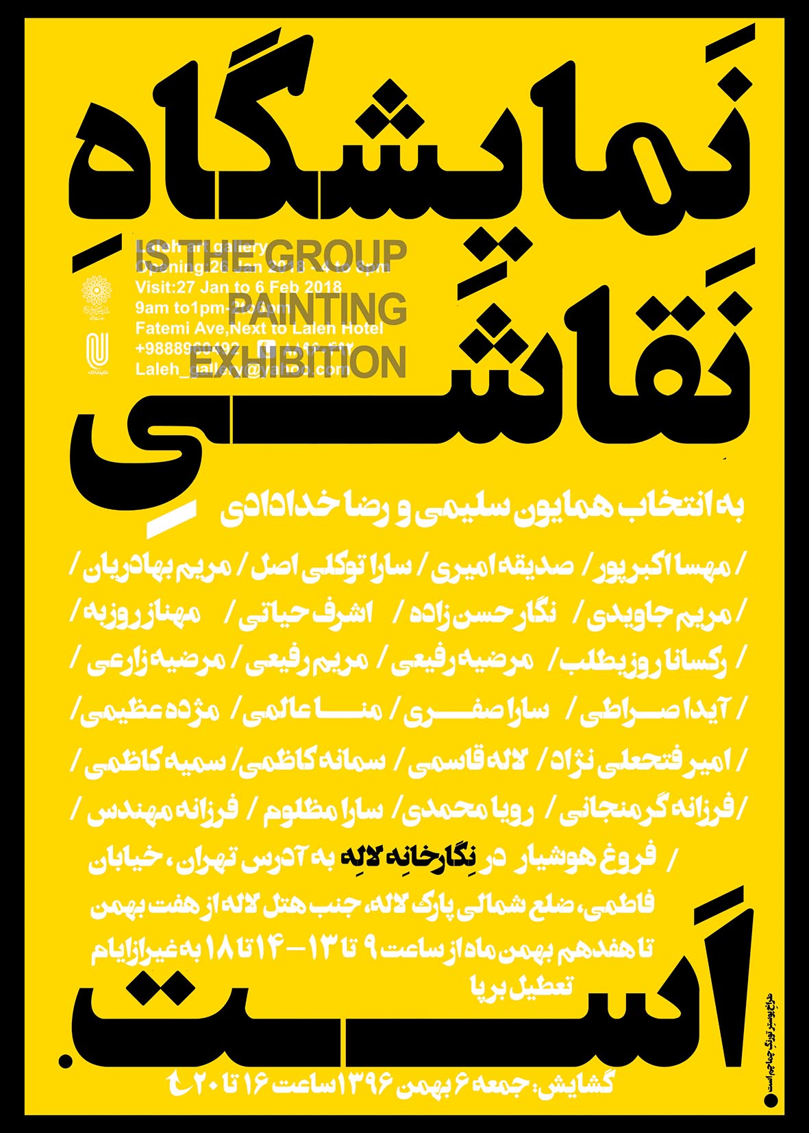 نمايشگاه گروهي نقاشي با آثاري از 26 هنرمند، روز جمعه 6 بهمن1396ساعت 16تا20 در نگارخانه لاله افتتاح مي‌‏شود.