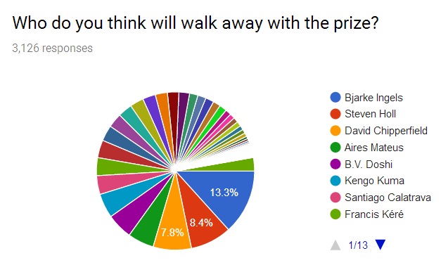 وبسايت آرک ديلي همچون سال گذشته اين نظرسنجي را در ارتباط با فرد مناسب براي دريافت جايزه پريتزکر 2018 ترتيب داده است. مقصود اين نشريه از اين نظرسنجي تنها گمانه زماني درباره اينکه در نهايت چه کسي برنده اين جايزه خواهد بود، نيست بلکه بيشتر ناظر بر اين است که خوانندگان عنوان کنند که از نظرشان چه فردي شايستگي آن را دارد و به چه دليل؟
