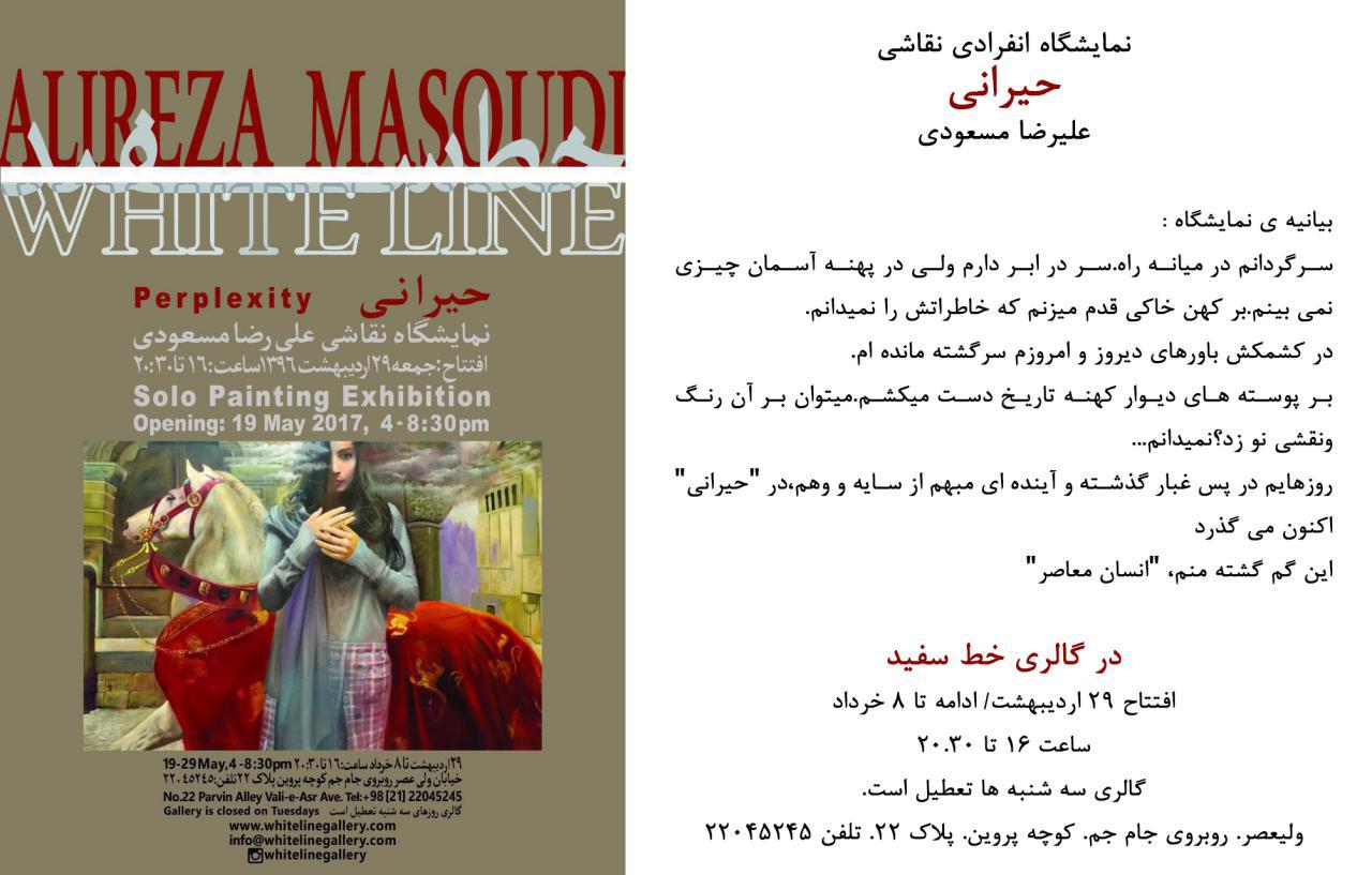 لازم بذکر است اين نمايشگاه تا روز دوشنبه هشتم خرداد ماه 96در گالي هنري خط شفيد به آدرس خيابان وليعصر، روبروي جام جم، کوچه پروين، پلاک 22 مراجعه نمايند.