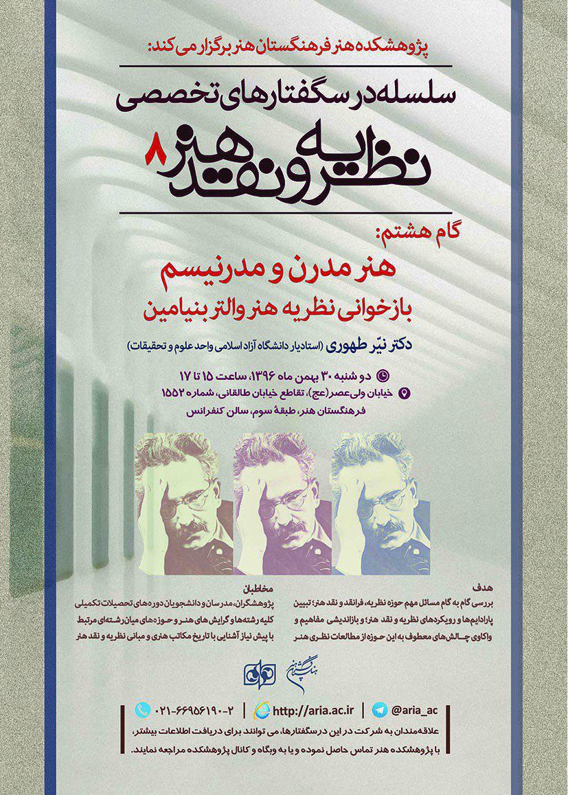 به گزارش گالري آنلاين به نقل از روابط عمومي فرهنگستان هنر، دراين درسگفتار كه به همت گروه نظريه و نقد هنر پژوهشكده هنر و با همكاري معاونت فرهنگي وهنري فرهنگستان هنر برگزار مي‌شود «دكترنيّر طهوري»، استاد‌يار دانشگاه آزاد اسلامي واحد علوم و تحقيقات با موضوع «هنر مدرن و مدرنيسم؛ بازخواني نظريه هنر والتر بنيامين» سخنراني مي‌كند.