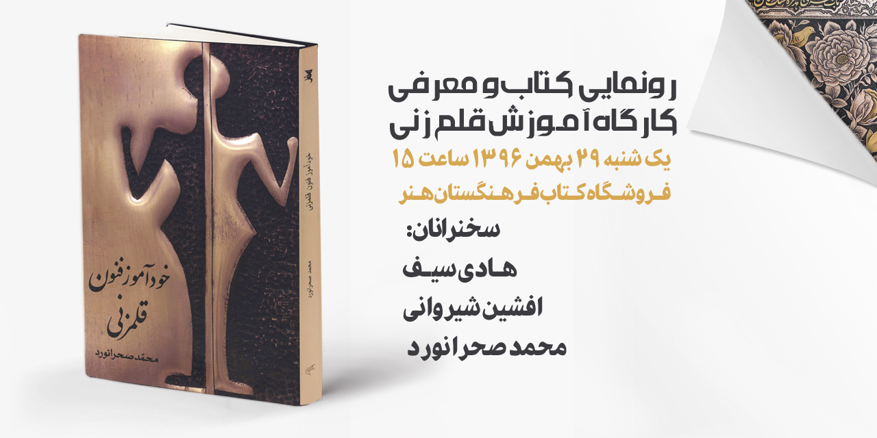 به گزارش گالري آنلاين به نقل از روابط عمومي فرهنگستان هنر، مراسم رونمايي كتاب خودآموز فنون قلمزني با حضور مولف كتاب برگزار ميشود. هادي سيف نويسنده و پژوهشگر برجسته هنرهاي مردمي ايران، افشين شيرواني سرپرست موسسه متن و محمد صحرا نورد، پژوهشگر، هنرمند عرصه قلمزني و مولف كتاب خود آموز فنون قلمزني به سخنراني ميپردازند. همچنين در اين مراسم کارگاه آموزشي قلمزني که بهار سال آينده در فرهنگستان برگزار ميشود، معرفي خواهد شد.