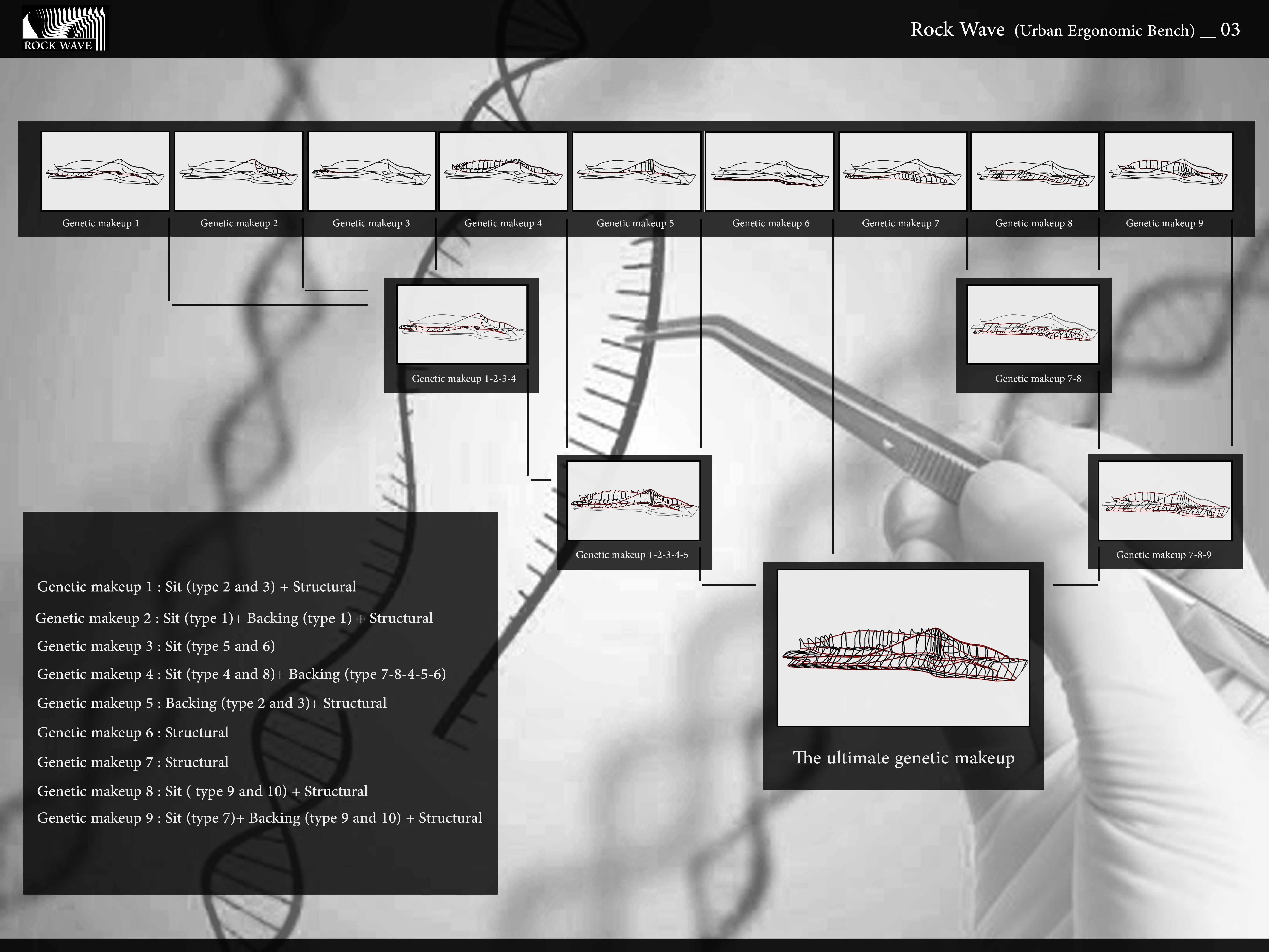 طبق تحقيقات،استراحت بدن در شرايط نامطلوب به مرور زمان سبب ايجاد درد و بي حسي در کمر و پاها ميشوند؛به همين دليل استفاده از نيمکت هايي که فشار وزن را به مفاصل، بافت هاي نرم و همچنين ديسک ها منتقل ميکند توصيه نمي شود. حال به کمک آرايش ژنتيکي، توالي از ضوابط ارگونومي انسان ها (نسبت به وزن – قد)در فيگورهاي مختلف استراحت تشکيل داديم؛که همچون اکوسيستمي در کنار يکديگر فعاليت کرده و مفهوم جذابيت و مجسمه سازي عمومي را هم دربردارد.